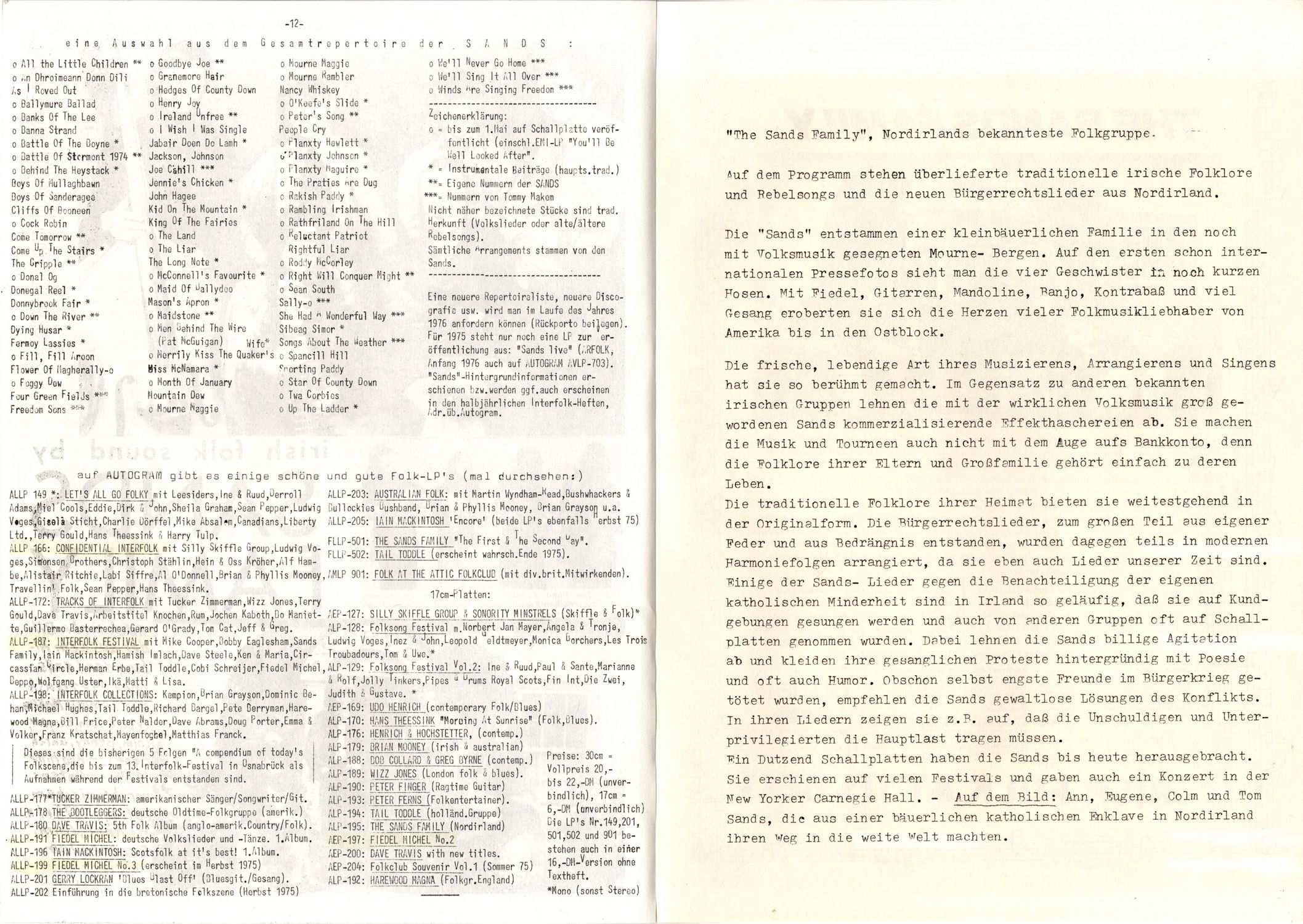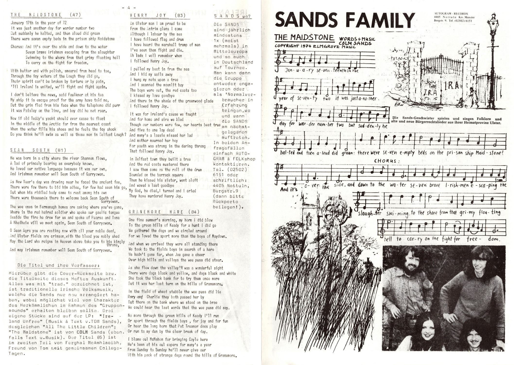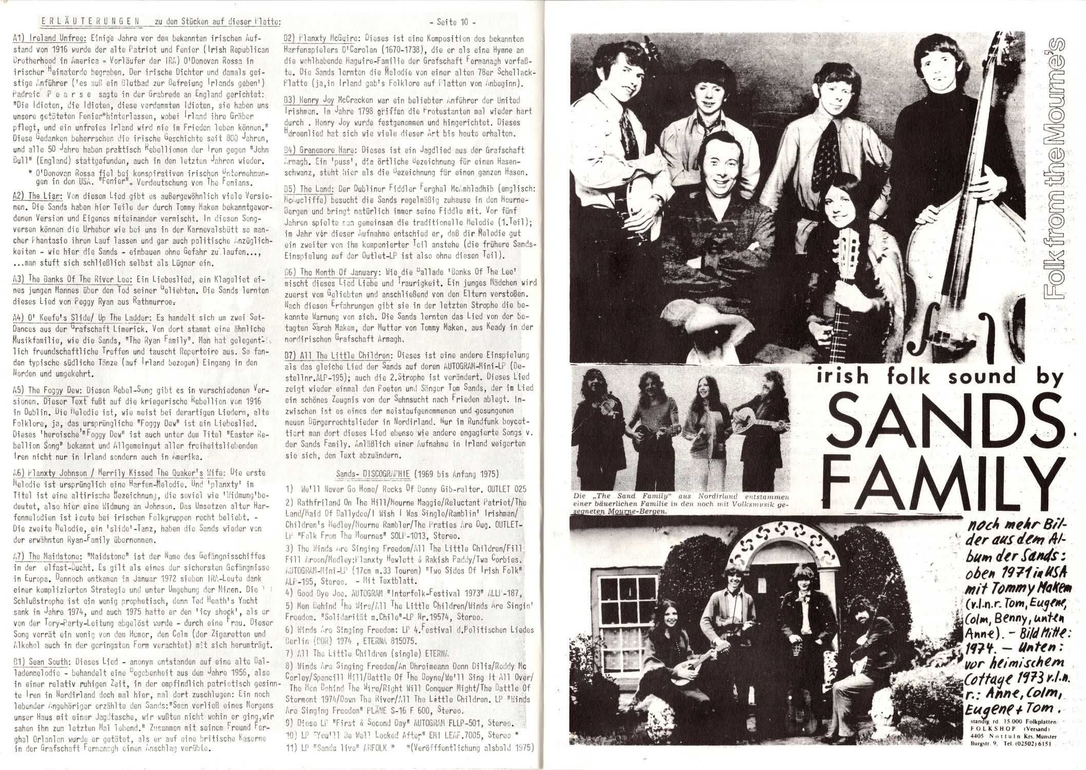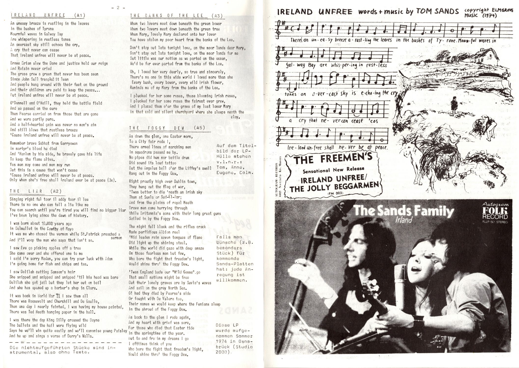 The back cover or front page of this issue provides information about this. Anything with "trad." is traditional Irish folk music, which the Sands have simply rearranged, retaining as much of the traditional character as possible within the framework of the "group sound". Three of my own pieces are on the LP: "Ireland Unfree" (music & lyrics by TOM Sands), also "All The Little Children"; "The Maidstone" is by COLM Sands (also lyrics & music). The track 85) is in the second part by Ferghal McAmhlaoibh, Friend of Tom's since their college days together.