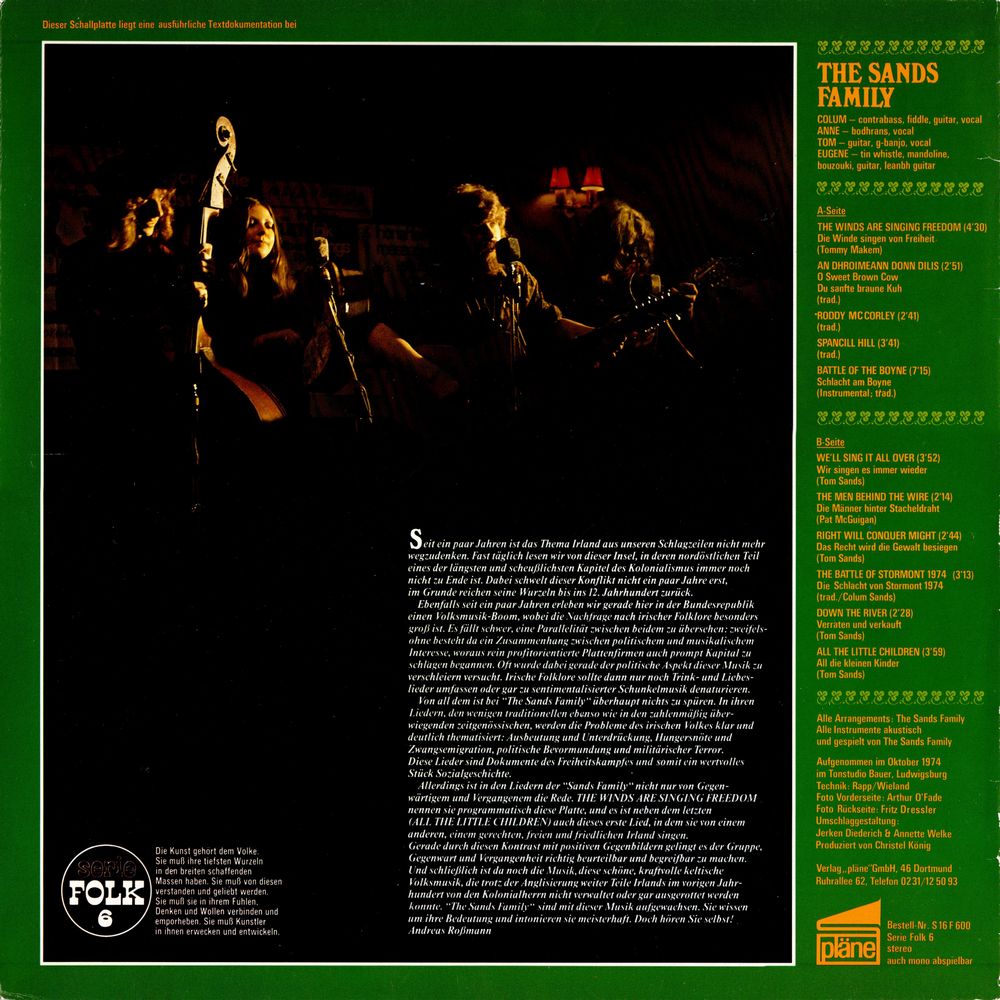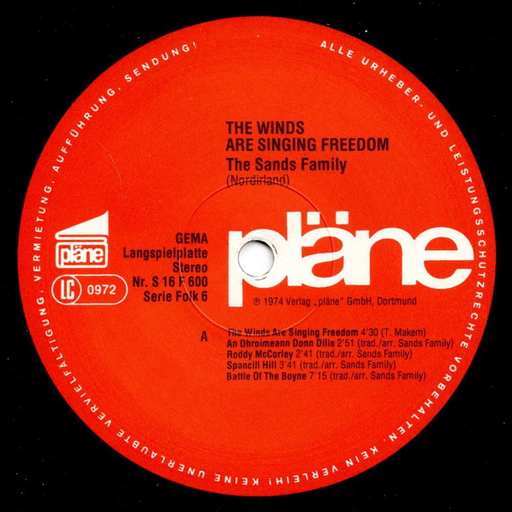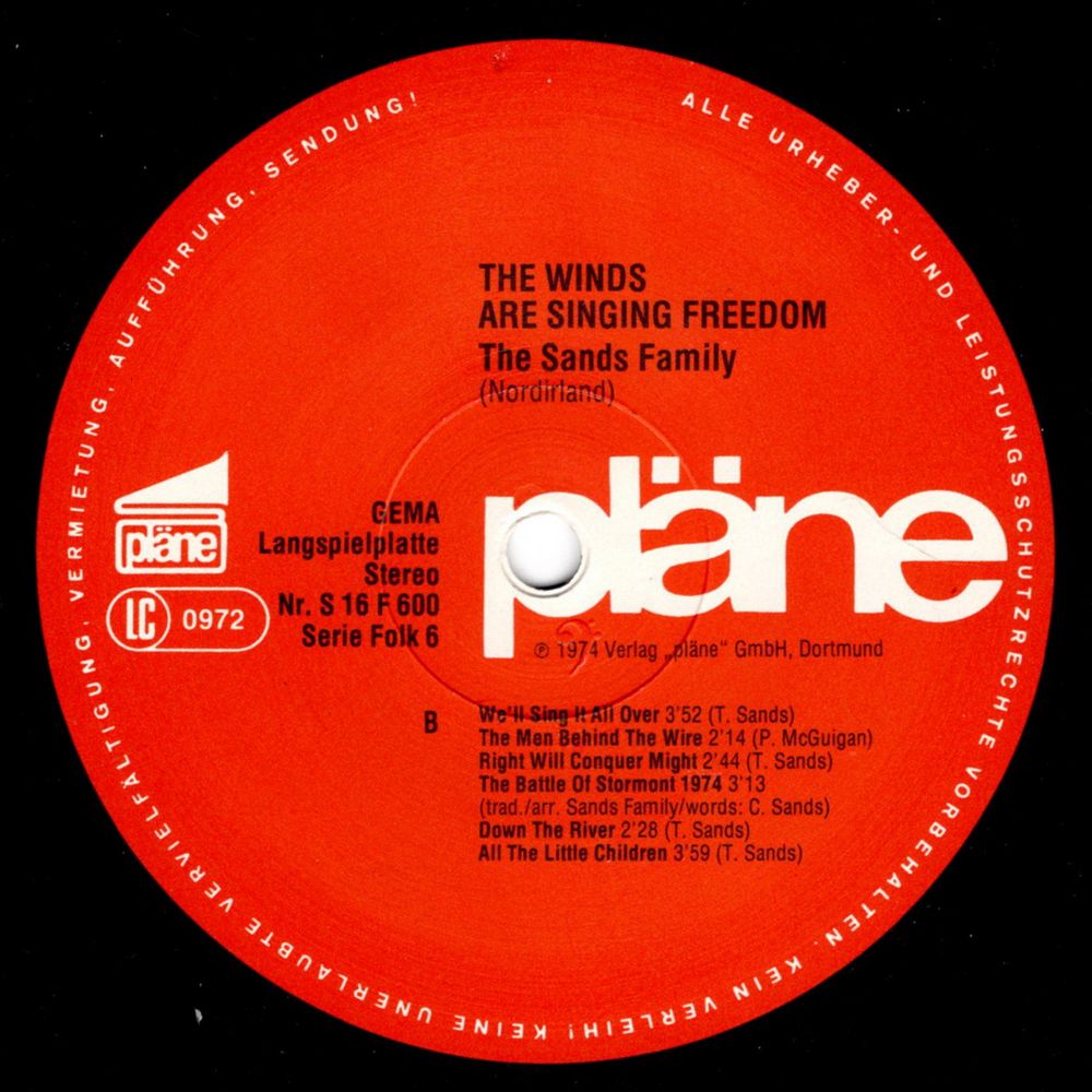 However, the songs of the "Sands Family" not only talk about the present and the past. THE WINDS ARE SINGING FREEDOM they programmatically call this record, and next to the last one (ALL THE LITTLE CHILDREN) is also this first song in which they sing about another, just, free and peaceful Ireland.