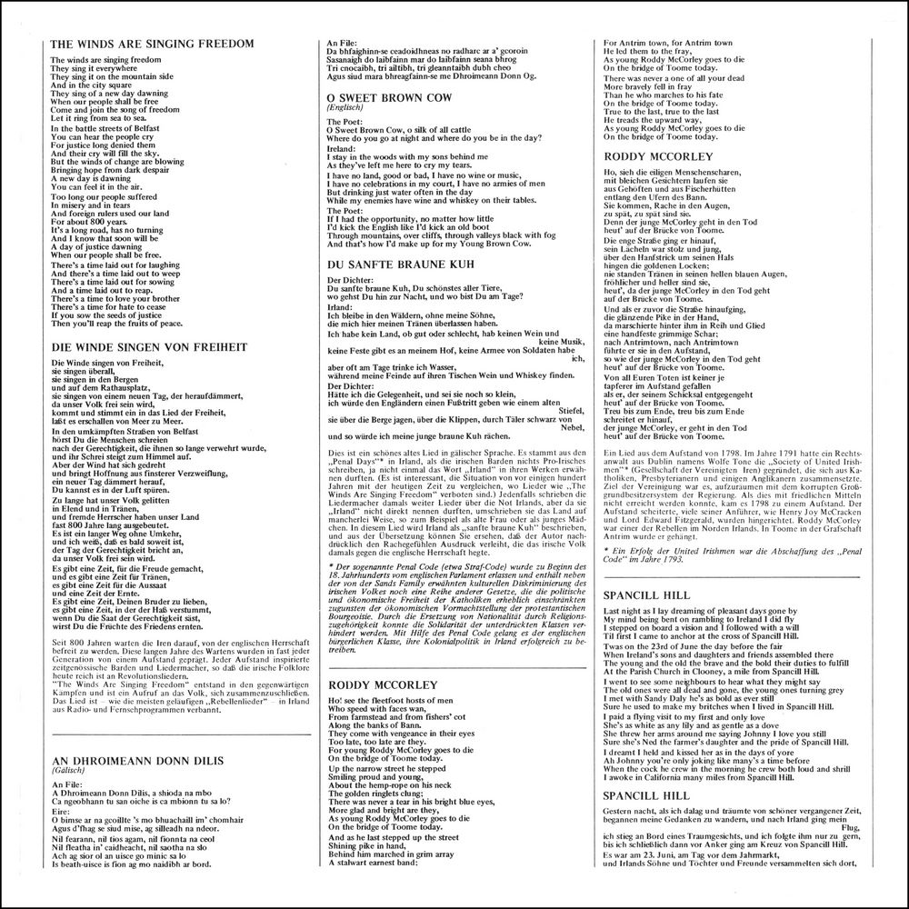 "The Winds Arc Singing Freedom" emerged in the current struggles and is an appeal to the people to unite. The song is — like most common "rebel songs" in Ireland banished from radio and television programs.