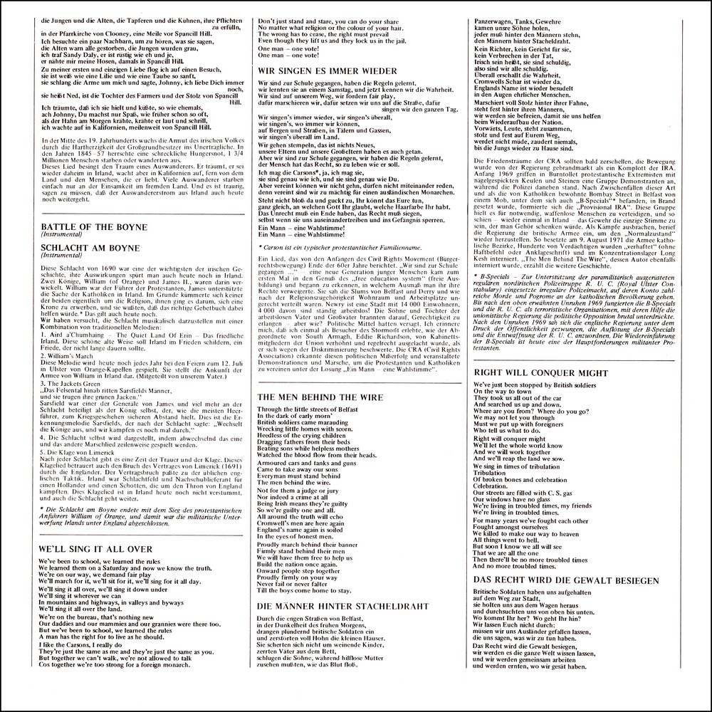 For a few years now, we have been experiencing a folk music boom here in Germany, where the demand for Irish folklore is particularly high. It is difficult to overlook a parallelism between the two: there is no doubt that there is a connection between political and musical interest, from which purely profit-oriented record companies began to capitalize promptly. Often the political aspect of this music was tried to disguise. Irish folklore should then only include drinking and love songs or even denature them to sentimentalized music.