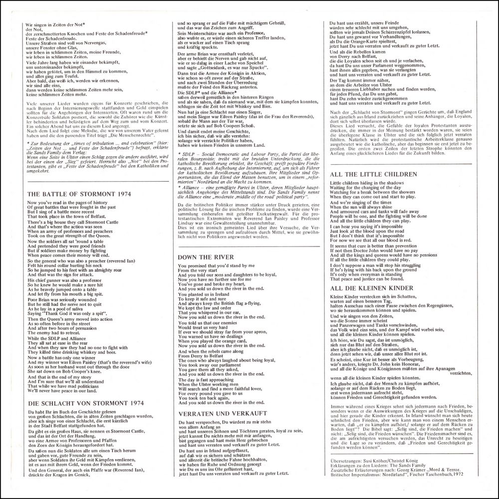 * Asked about the meaning of the "times of tribulation … and celebration" (here: "times of need … and festivals of gloating"), the Sands Family told the publisher: When one side in Ulster hits the other, one of them wins the "victory". If there is "emergency" among the Protestants, there are "feasts of glee" among the Catholics and vice versa.