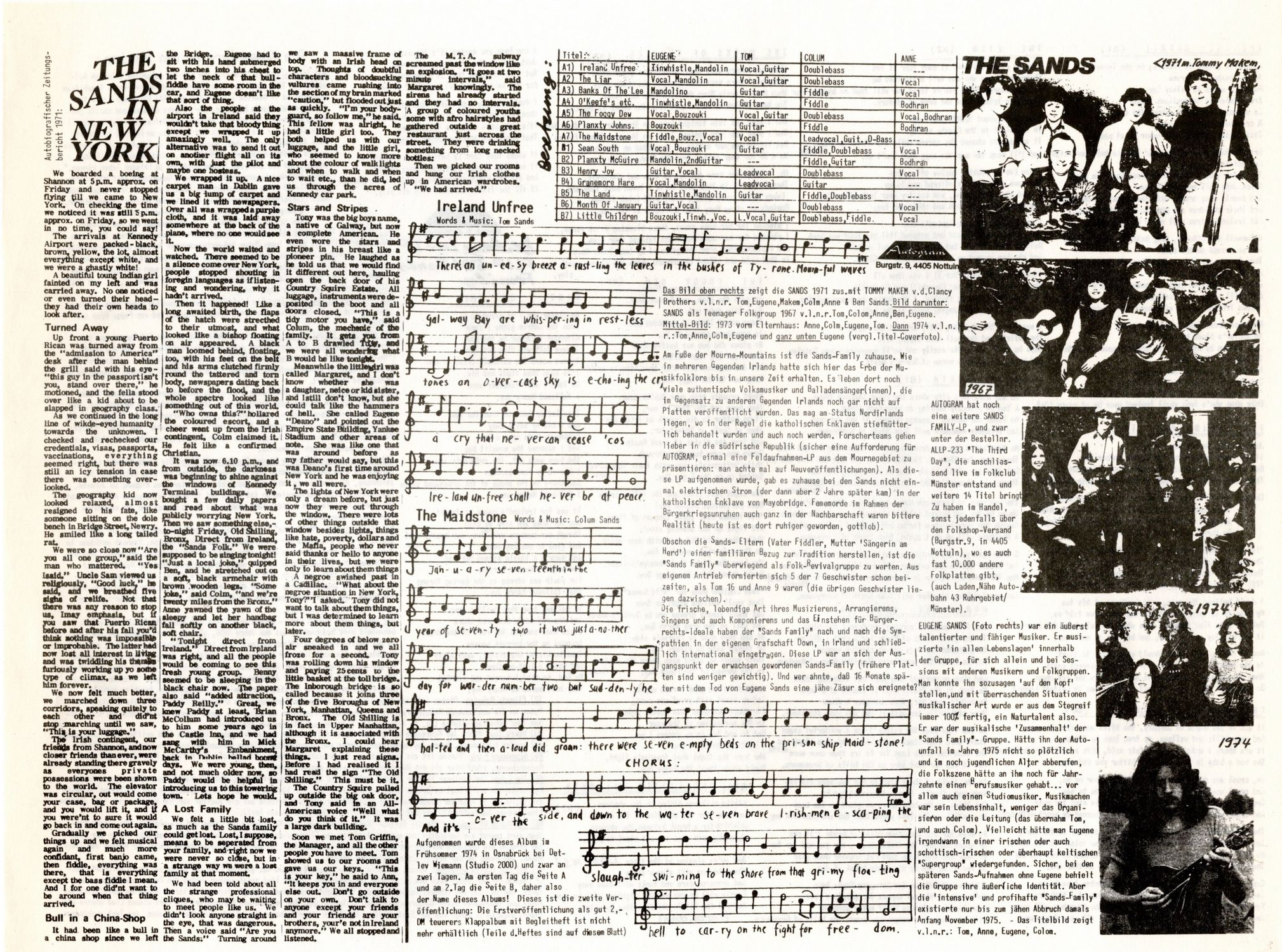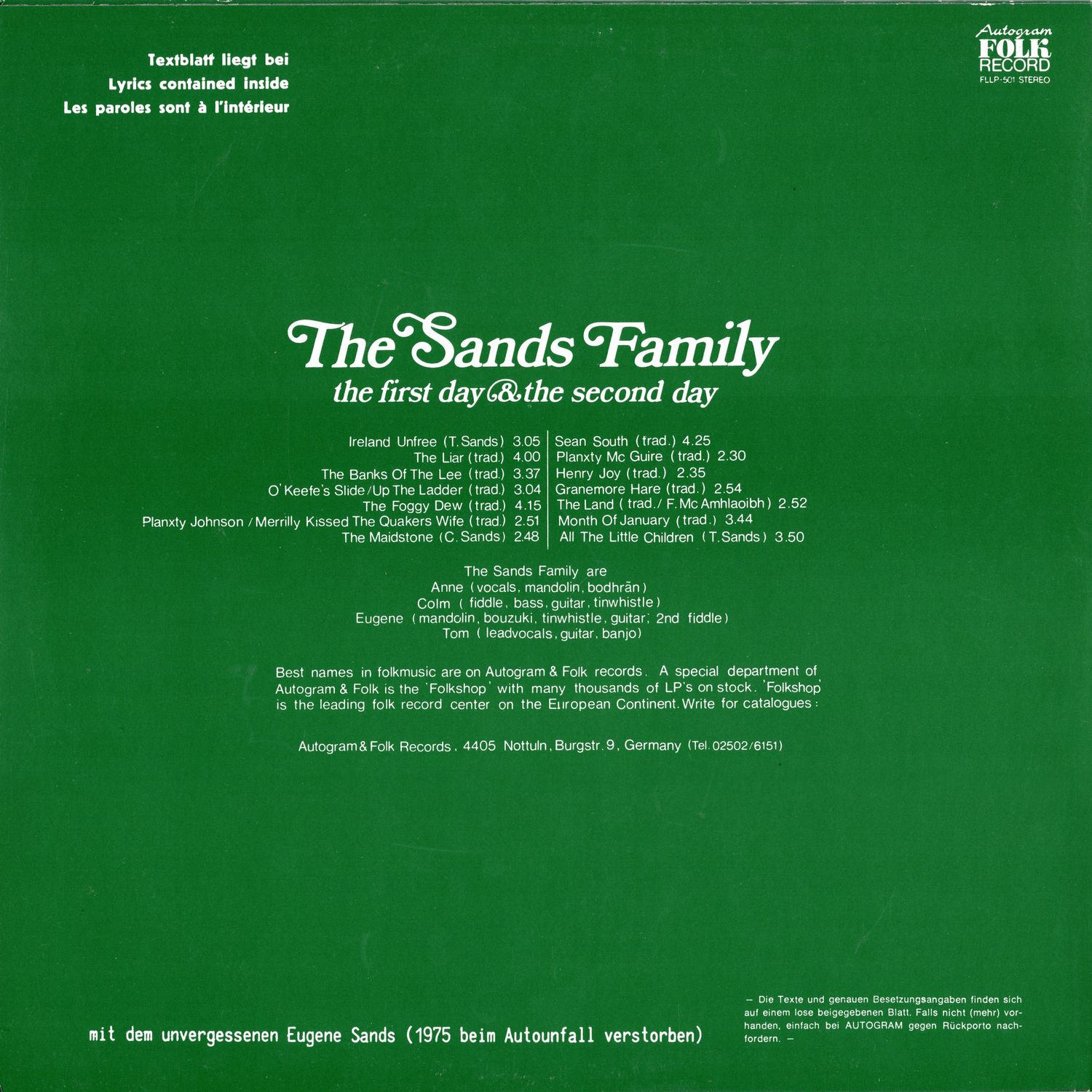 EUGENE SANDS was an extremely talented and accomplished musician. He played music 'in all situations' within the group, alone and in sessions with other musicians and folk groups. You could turn him 'on his head', so to speak, and he always dealt with surprising musical situations 100% straight away, so he was a natural talent. He was the musical 'cohesion' of the "Sands Family" group. If the car accident in 1975 hadn't taken him away so suddenly and at a young age, the folk scene would have had him as a professional musician for decades … especially as a studio musician. Making music was his life's purpose, rather than organizing or directing (Tom did that, and also Colom). Maybe at some point Eugene would have been found in an Irish or Scottish-Irish or even Celtic "supergroup". Certainly, in the later Sands recordings without Eugene, the group retained their external identity. But the 'intense' and professional 'Sands family' only existed until its abrupt demolition at the beginning of November 1975. — The cover photo shows from left to right: Tom, Anne, Eugene, Colom.