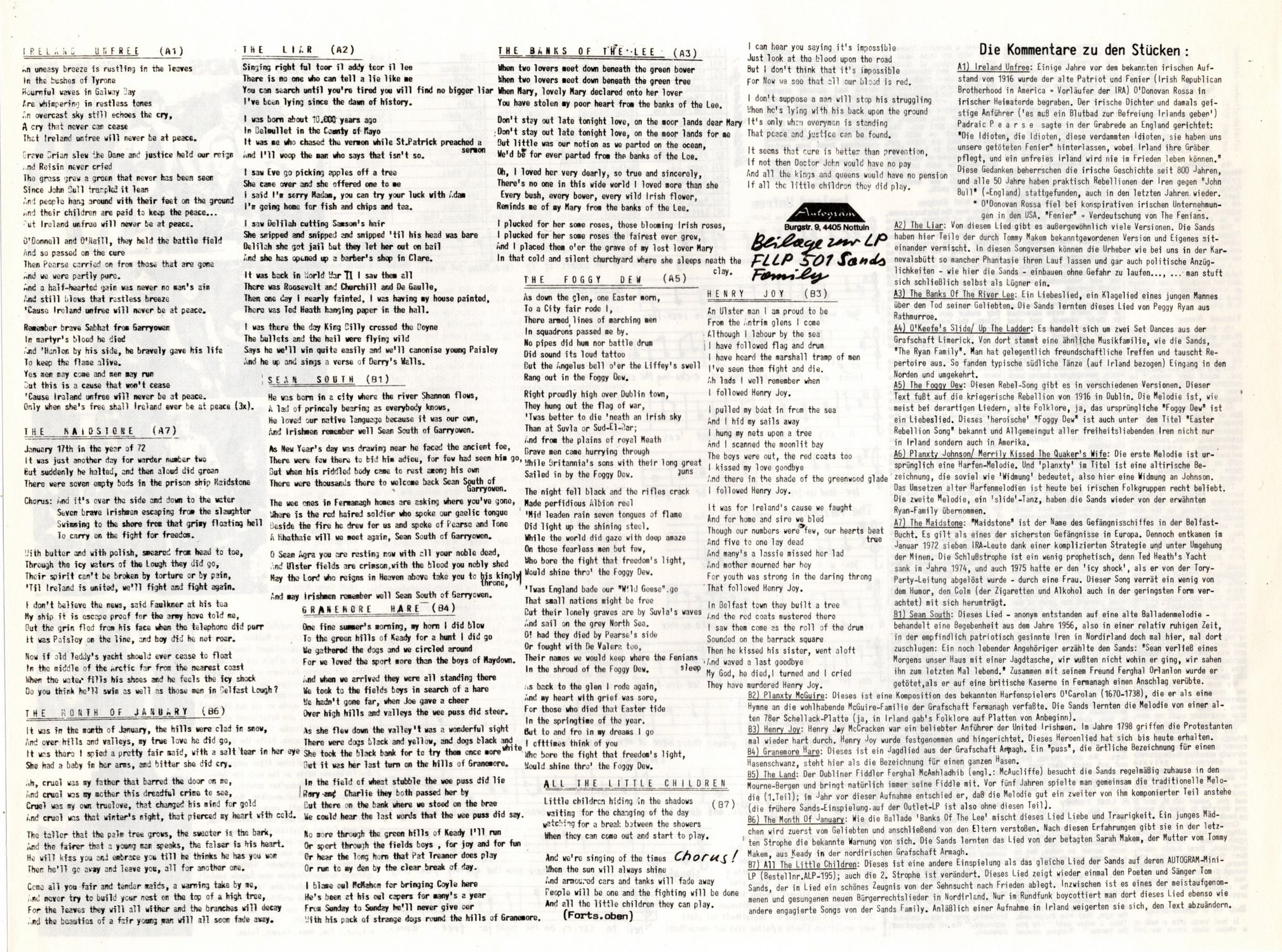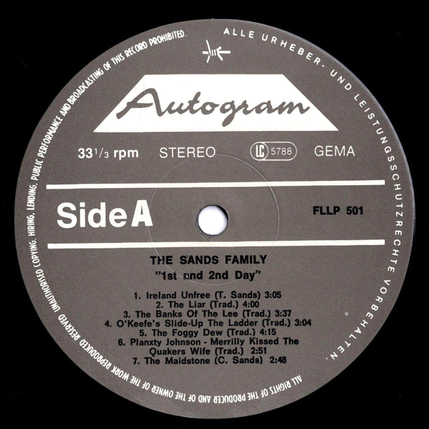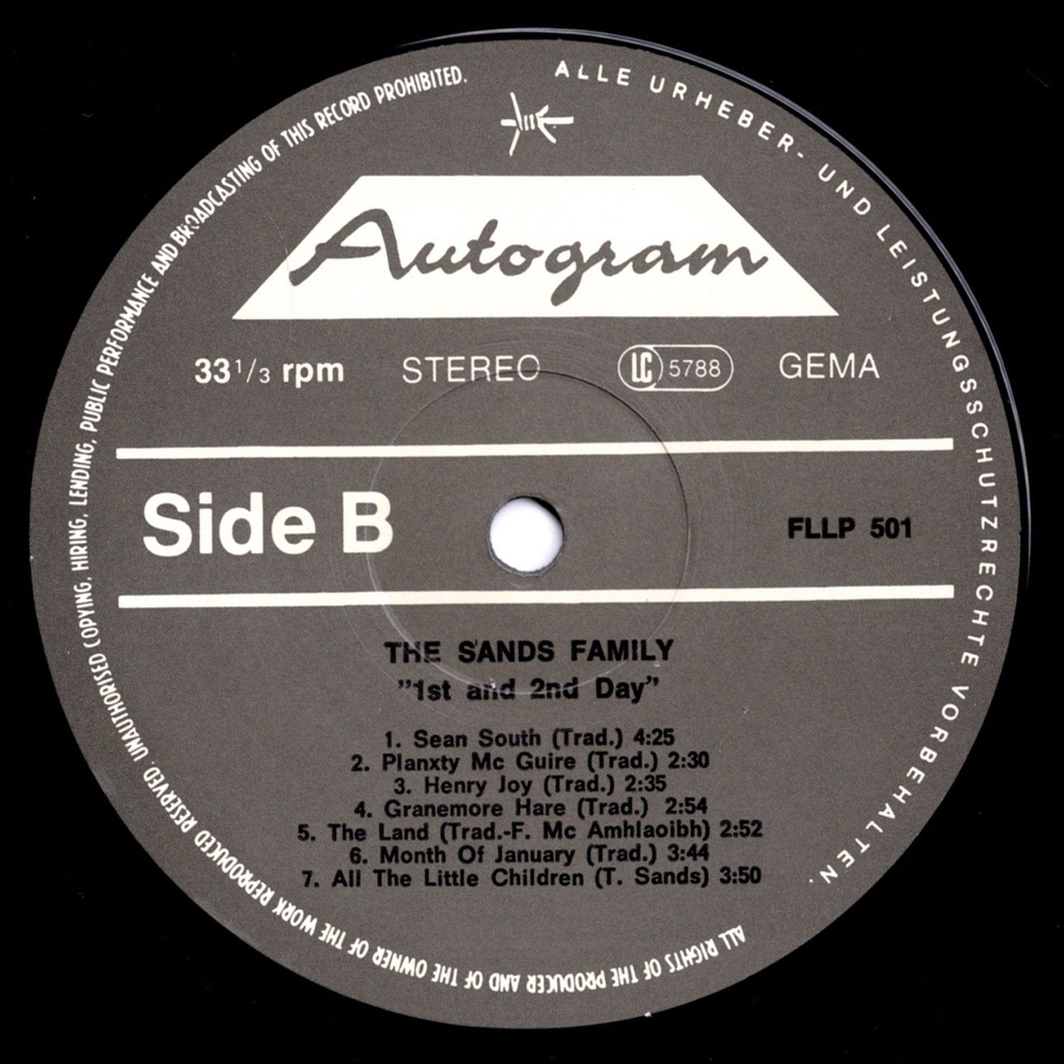 All The Little Children — This is a different recording than the same Sands song on their AUTOGRAM mini-LP (item no. ALP-195); the 2nd verse is also changed. This song once again features the poet and singer Tom Sands, who in the song bears beautiful witness to the longing for peace. It is now one of the most recorded and sung new civil rights songs in Northern Ireland. Only on the radio is this song boycotted there, as well as other committed songs by the Sands Family. When recording in Ireland they refused to change the lyrics.