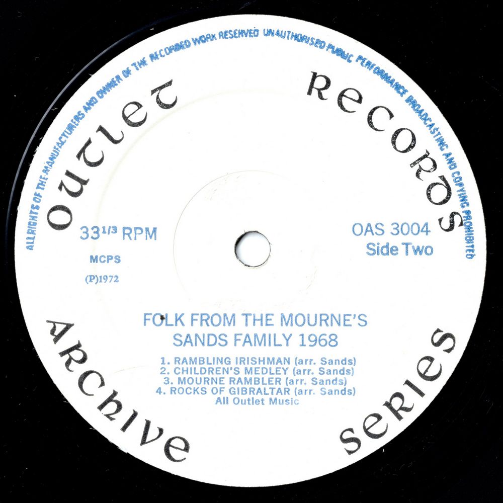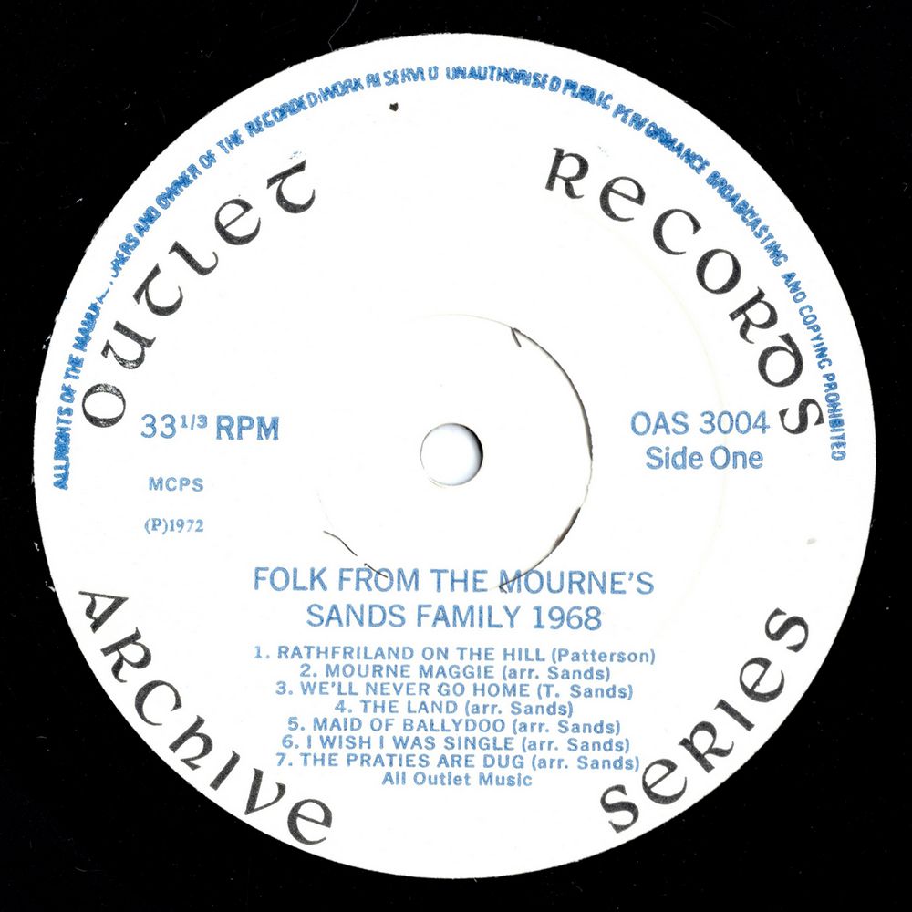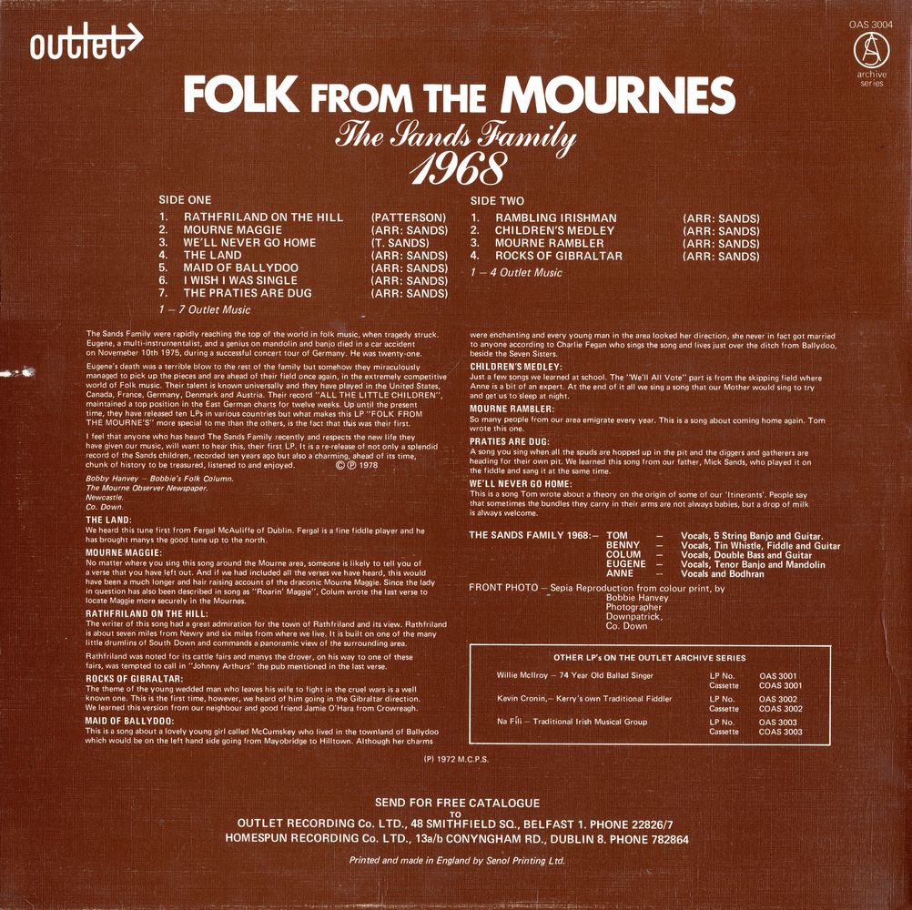 Eugene's death was a terrible blow to the rest of the family but somehow, they miraculously managed to pick up the pieces and are ahead of their field once again, in the extremely competitive world of Folk music. Their talent is known universally, and they have played in the United States, Canada, France, Germany, Denmark and Austria. Their record "ALL THE LITTLE CHILDREN", maintained a top position in the East German charts for twelve weeks. Up until the present time, they have released ten LPs in various countries but what makes this LP "FOLK FROM THE MOURNE'S" more special to me than the others, is the fact that this was their first.