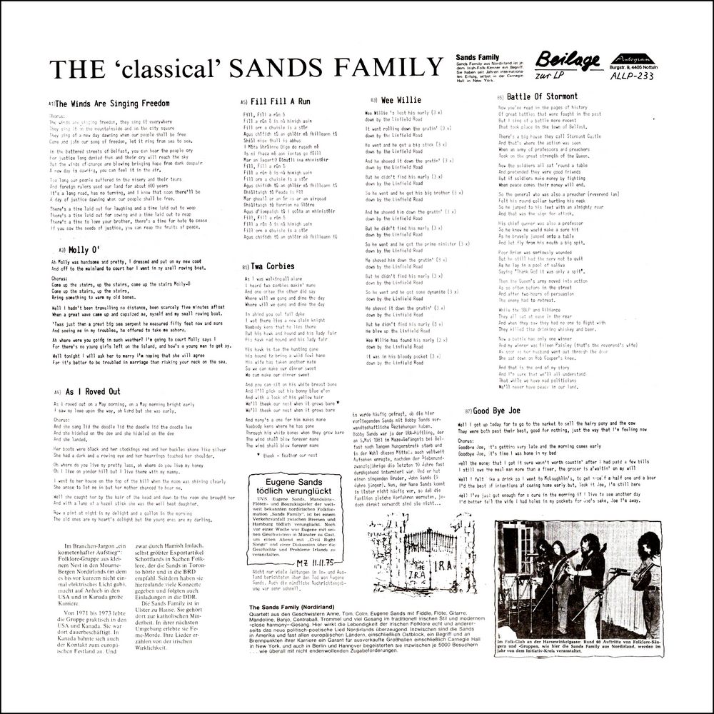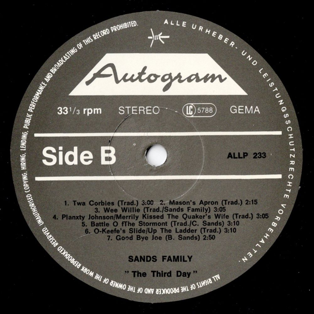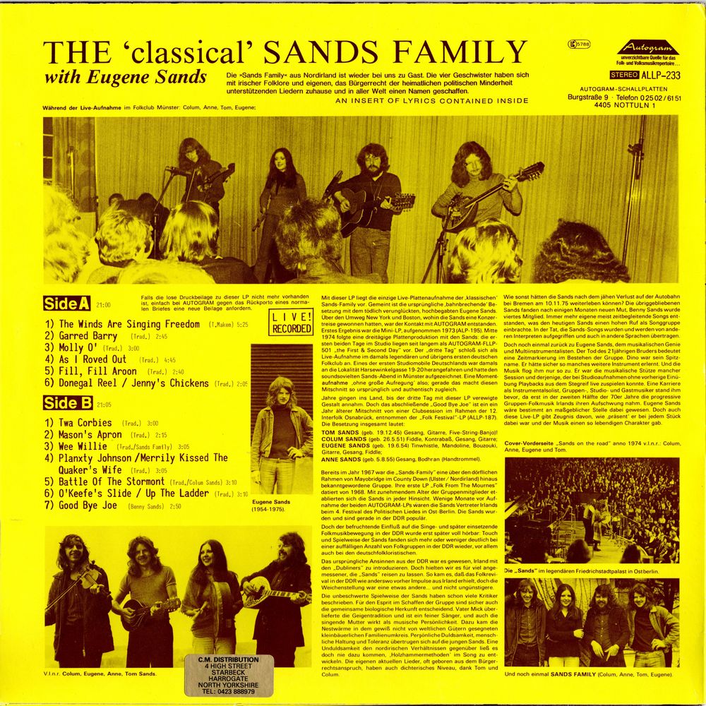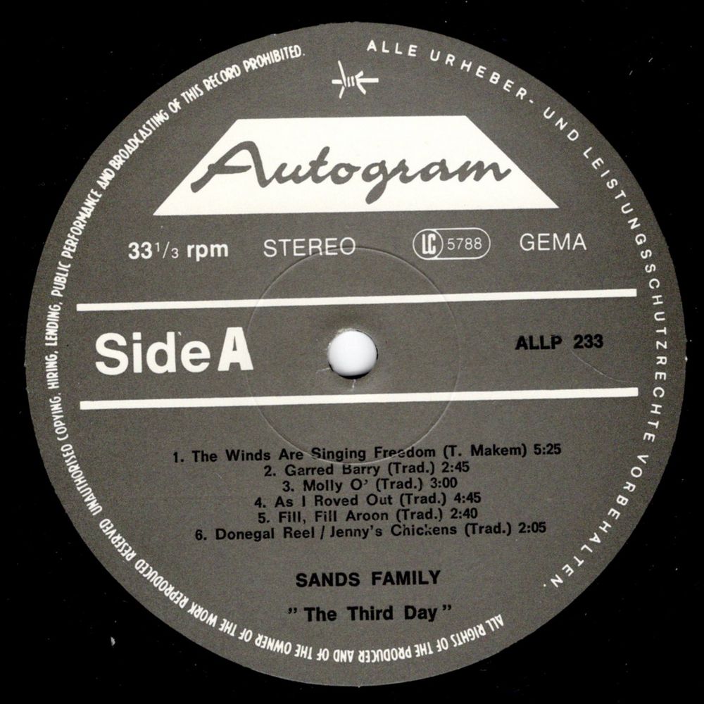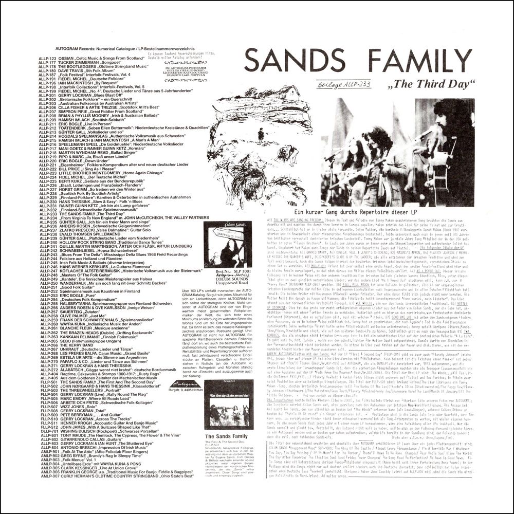 "This LP is the 'only' live recording of the 'classic' Sands Family." This refers to the original, "groundbreaking" line up, with the gifted Eugene Sands. These recordings were made during a three-day period in mid-1974, in Germany. The first two days were recorded in the studio and released as The First & Second Day (Autogram-FLLP 501 LP). The "third day" was a live recording at the "legendary" Ührigens German folk club, recorded by one of the first mobile studios in Germany at Harsewinkelgasse 19-20 in Münster.