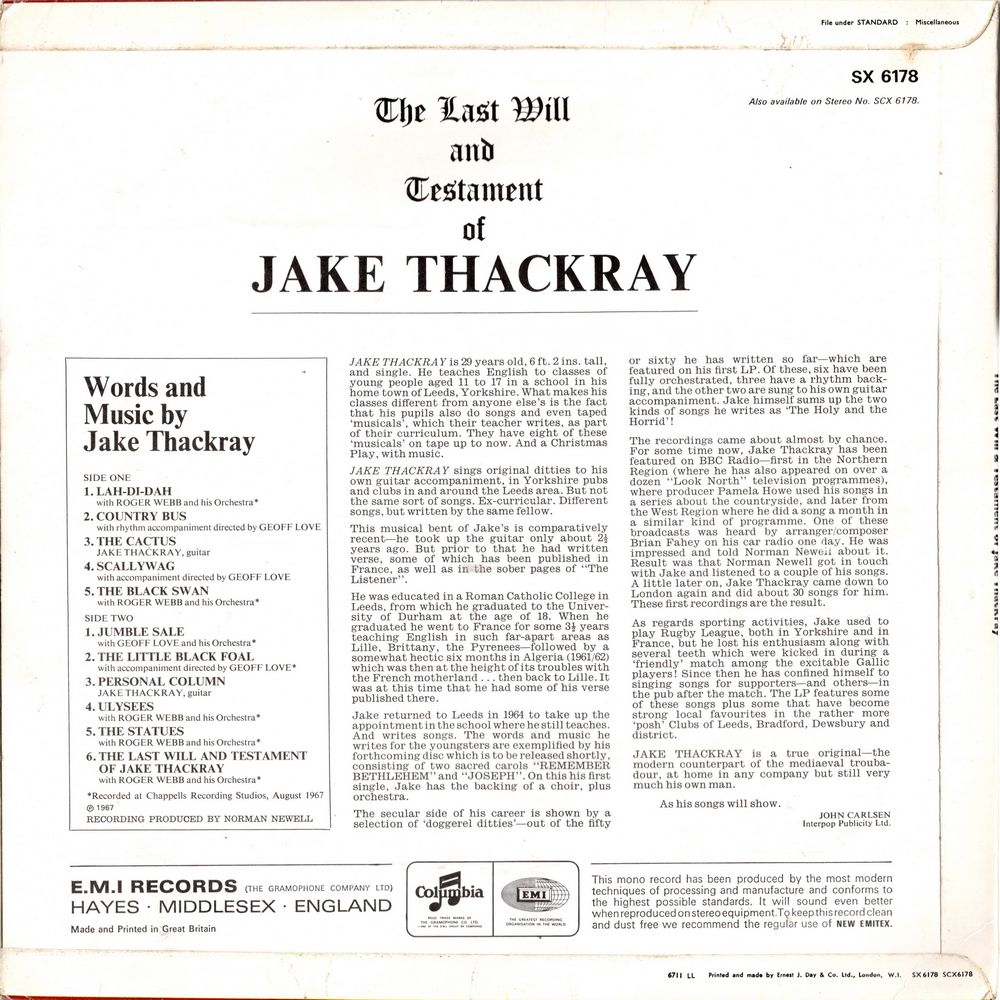 JAKE THACKRAY sings original ditties to his own guitar accompaniment, in Yorkshire pubs and clubs in and around the Leeds area. But not the same sort of songs. Ex-curricular. Different songs, but written by the same fellow.