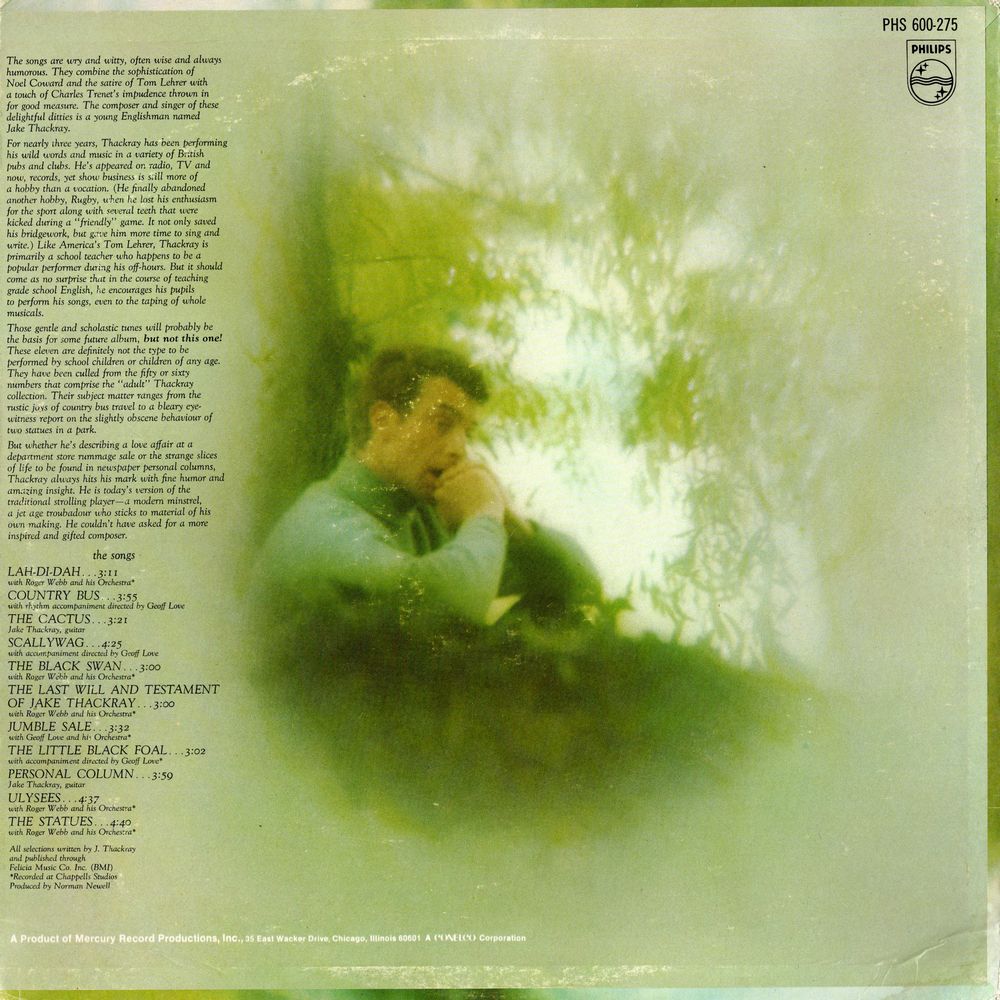 The songs are wry and witty, often wise and always humorous. They combine the sophistication of Noel Coward and the satire of Tom Lehrer with a touch of Charles Trenet's impudence thrown in for good measure. The composer and singer of these delightful ditties is a young Englishman named Jake Thackray.