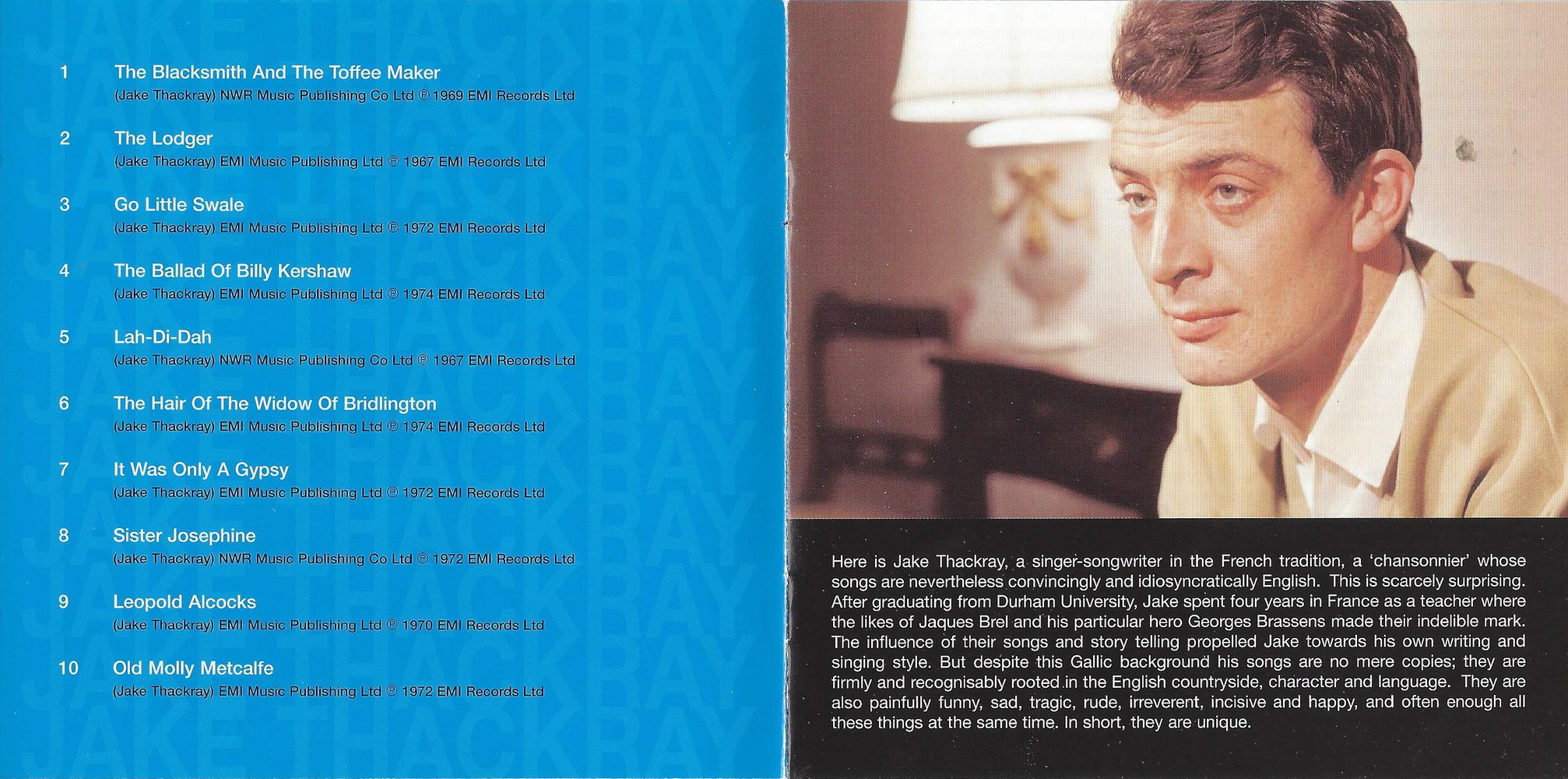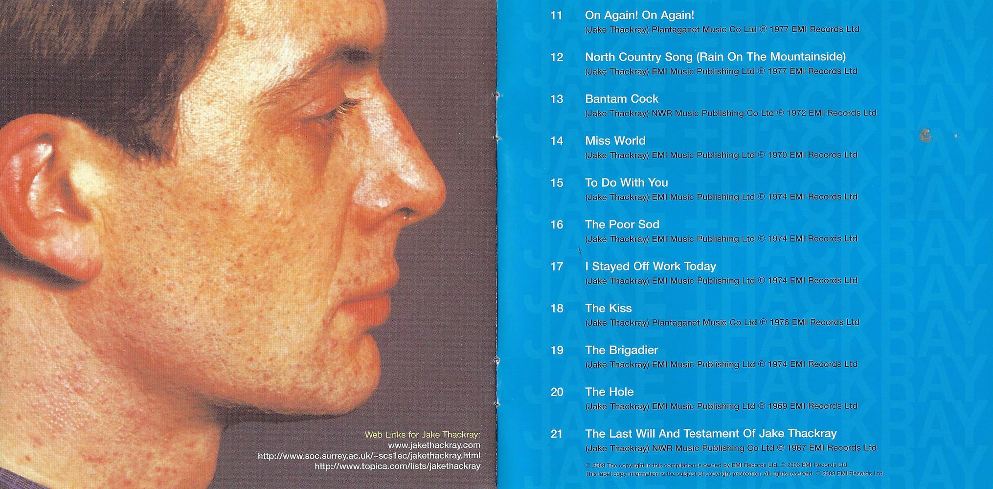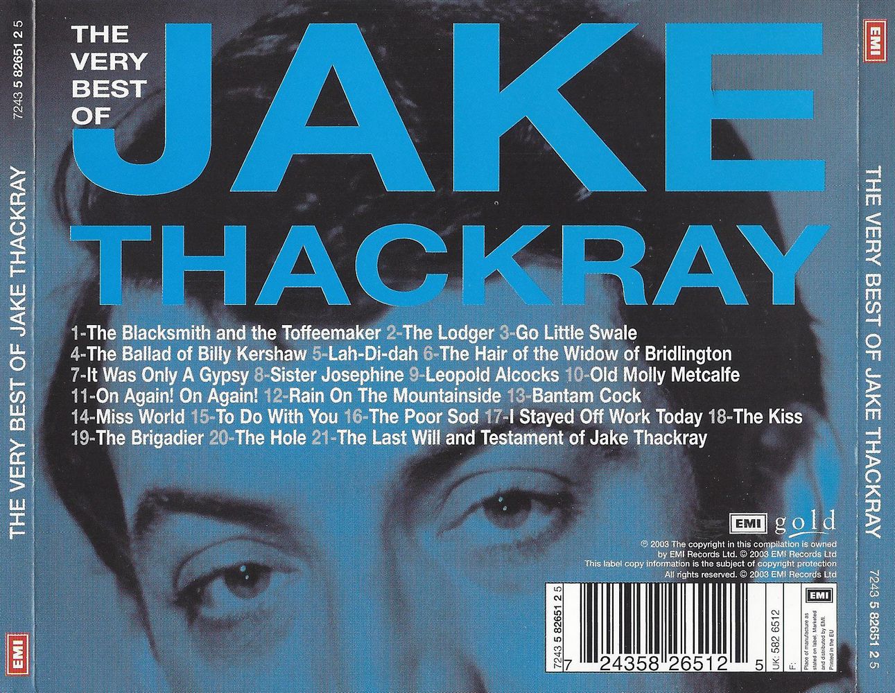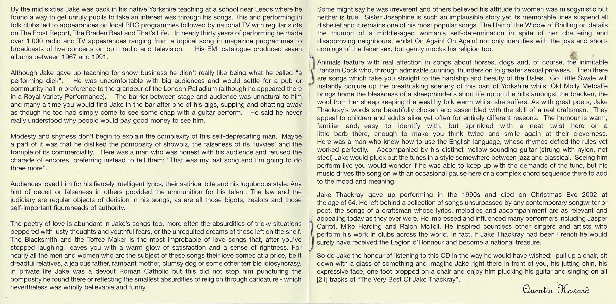So do Jake the honour of listening to this CD in the way he would have wished: pull up a chair, sit down with a glass of something and imagine Jake right there in front of you, his jutting chin, his expressive face, one foot propped on a chair and enjoy him plucking his guitar and singing on all [21] tracks of "The Very Best Of Jake Thackray".