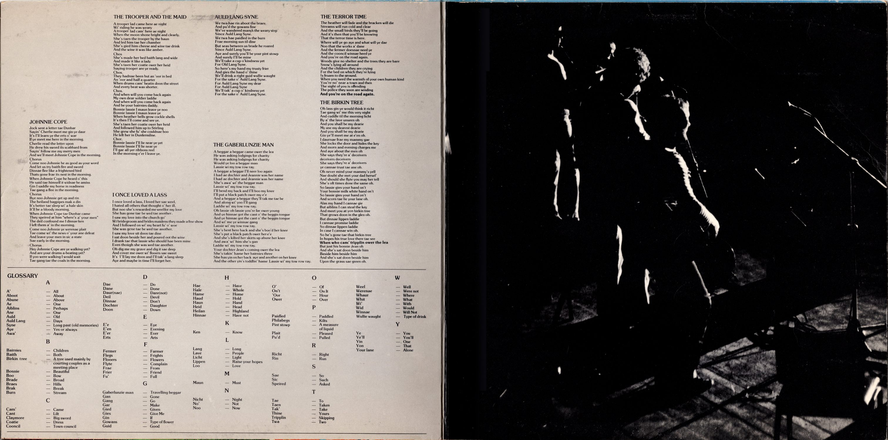 The Terror Time — For many years our favourite songwriter in the traditional style has been Ewen MacColl and for the first time we have tackled one of his songs on album. The song concerns the "travelling people" of our country who have been not only a living source of material for countless performers but also an endangered culture well worth saving by the might of the pen and the melody (if not by stronger means).