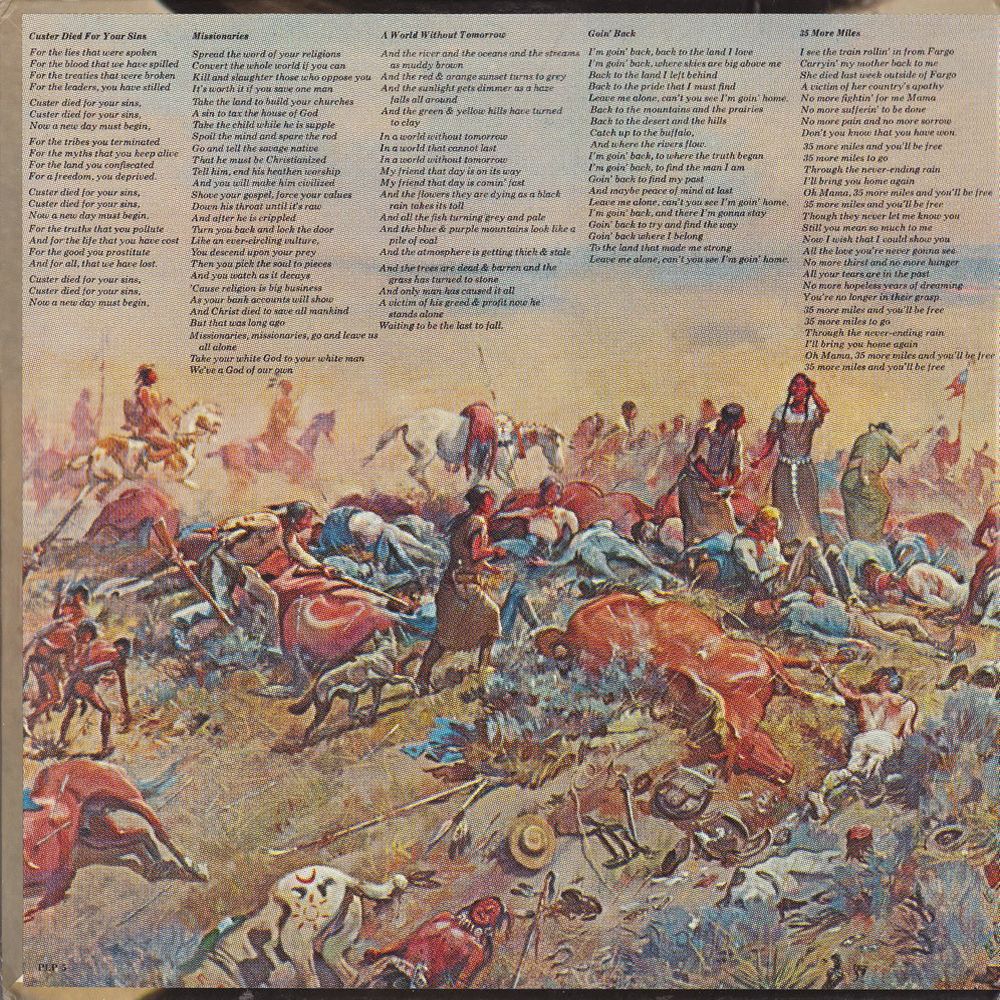 The defiant title song, Custer Died For Your Sins, could only be sung by one who has glimpsed the Indian renaissance in the reservation backwash of American society.