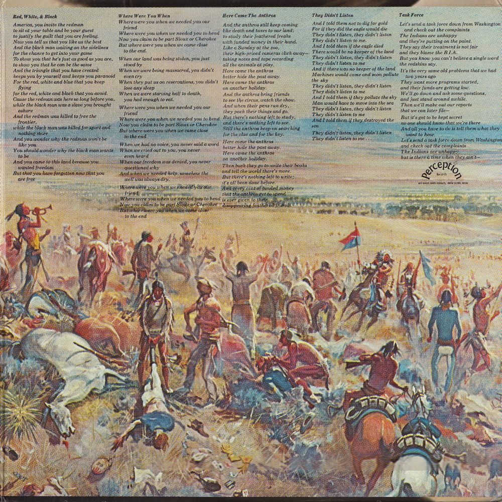 With this album the continental divide of oppression is crossed and a new day begins. Remember it as the years pass and a new history for the American Indian is forged out of the decades. Remember how the world was before the songs were heard. The day is corning when you will not remember how it started — that it started with this record.