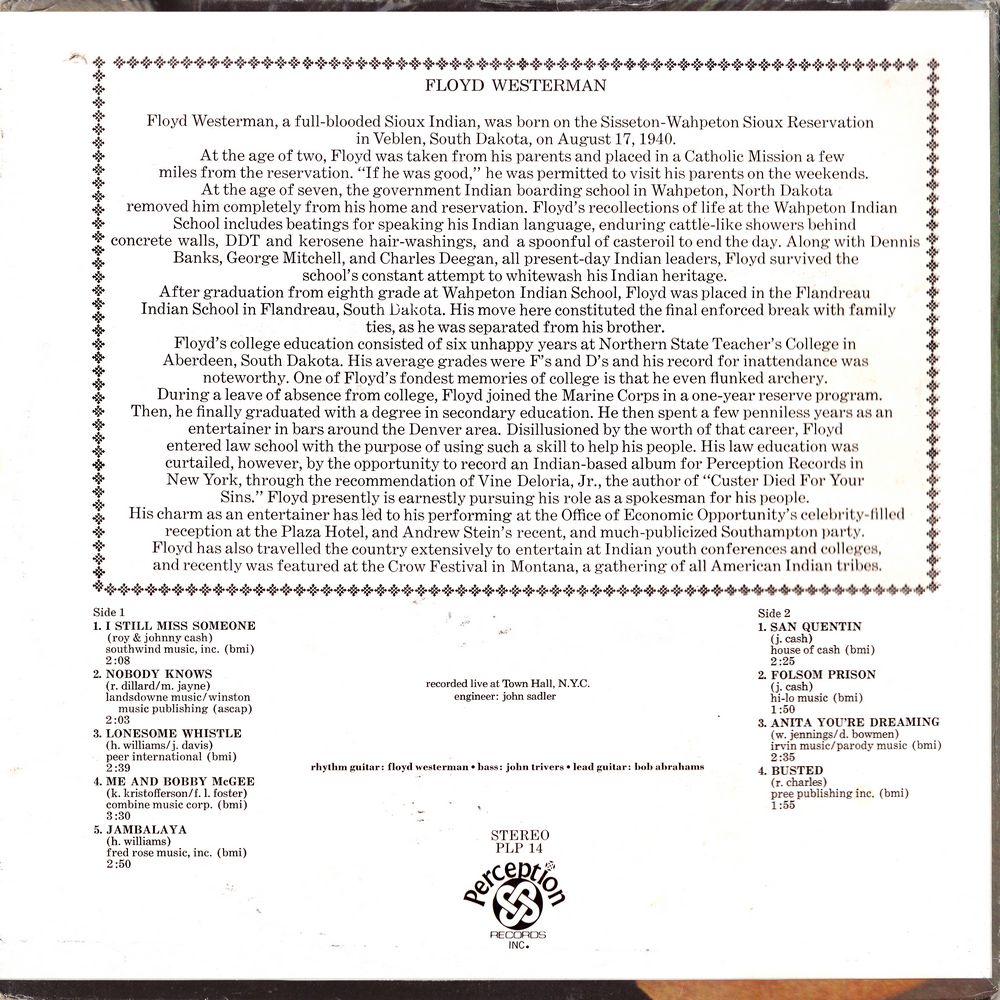 Floyd's college education consisted of six unhappy years at Northern State Teacher's College in Aberdeen, South Dakota. His average gardes were F's and D's and his record for inattendance was noteworthy. One of Floyd's fondest memories of college is that he even flunked archery. During a leave of absence from college, Floyd joined the Marine Corps in a one-year reserve program. Then, he finally graduated with a degree in secondary education. He then spend a few penniless years as an entertainer in bars around the Denver area. Disillusioned by the worth of that career, Floyd entered law school with the purpose of using such skills to help his people. His law education was curtailed, however, by the opportunity to record an Indian-based album for Perception Records in New York, through the recommendation of Vine Deloria, Jr., the author of "Custer Died For Your Sins." Floyd presently is earnestly pursuing his role as a spokesman for his people. His charm as an entertainer has led to his performing at the Office of Economic Opportunity's celebrity-filled reception at the Plaza Hotel, and Andrew Stein's recent, and much-publicized Southampton party. Floyd has also travelled the country extensively to entertain at Indian youth conferenes and colleges, and recently was featuren at the Crow Festival in Montana, a gathering of all American Indian tribes.