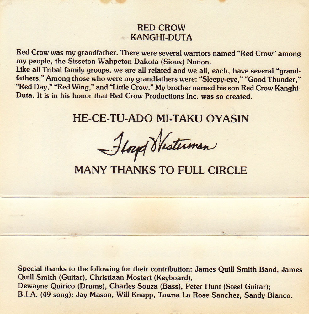 Like all Tribal family groups, we are all related and we all, each, have several "grandfathers." Among those who were my grandfathers were: "Sleepy-eye," "Good Thunder," "Red Day," "Red Wing," and "Little Crow." My brother named his son Red Crow Kanghi-Duta. It is in his honor that Red Crow Productions Inc. was so created.