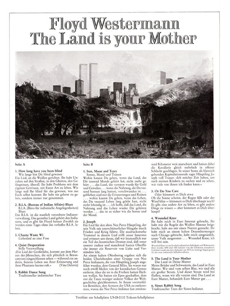 In the past decade Westerman has expanded his vision beyond the American Indian to include all peoples and in doing go has brought a measure of strength to those whose hearts were heavy. He has been gathering his children to him in the old traditional fashion — by example and by caring. His new songs have given us a better vision of ourselves; they heal and comfort us and help us to move forward even as they remind us of the past from which we are emerging.