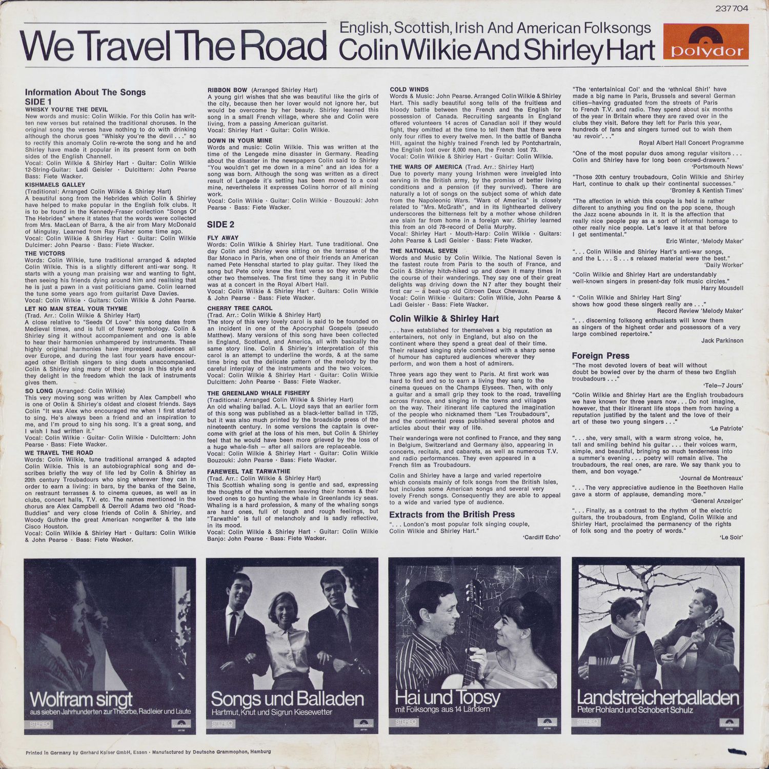 We Travel The Road — This is an autobiographical song and describes briefly the way of life led by Colin & Shirley as 20th century Troubadours who sing wherever they can in order to earn a living: in bars, by the banks of the Seine, on restaurant terraces & to cinema queues, as well as in clubs, concert halls, T.V. etc. The names mentioned in the chorus are Alex Campbell & Derroll Adams two old "Road-Buddies" and very close friends of Colin & Shirley, and Woody Guthrie the great American songwriter & the late Cisco Houston.