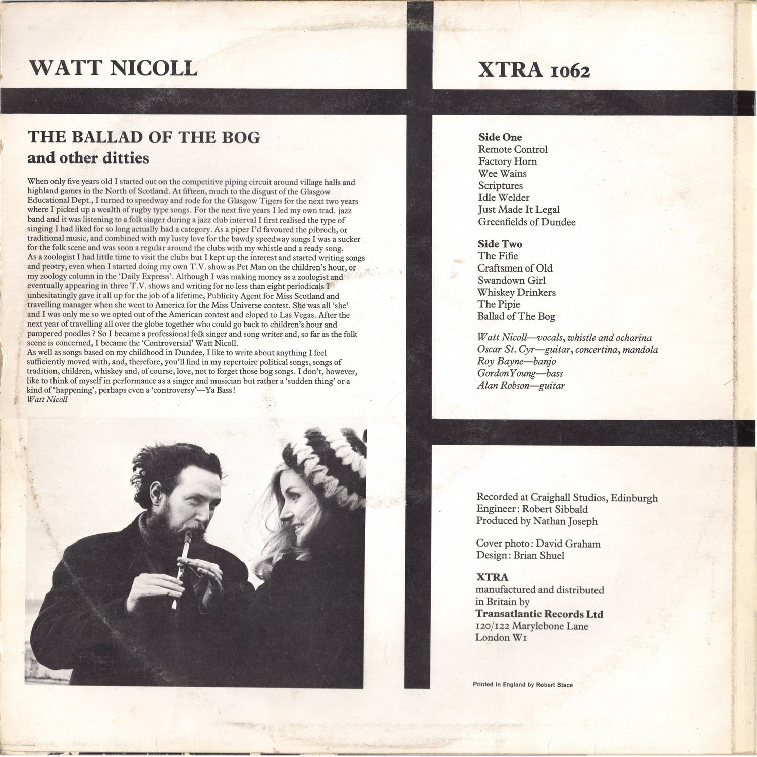 As a zoologist I had little time to visit the clubs but I kept up the interest and started writing songs and poetry, even when I started doing my own T.V. show as Pet Man on the children's hour, or my zoology column in the 'Daily Express'. Although I was making money as a zoologist and eventually appearing in three T.V. shows and writing for no less than eight periodicals I unhesitatingly gave it all up for the job of a lifetime, Publicity Agent for Miss Scotland and travelling manager when she went to America for the Miss Universe contest. She was all 'she' and I was only me so we opted out of the American contest and eloped to Las Vegas. After the next year of travelling all over the globe together who could go back to children's hour and pampered poodles? So I became a professional folk singer and song writer and, so far as the folk scene is concerned, I became the 'Controversial' Watt Nicoll.