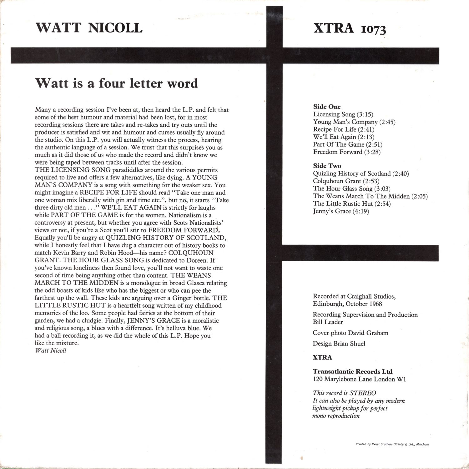 THE LICENSING SONG paradiddles around the various permits required to live and offers a few alternatives, like dying. A YOUNG MAN's COMPANY is a song with something for the weaker sex. You might imagine a RECIPE FOR LIFE should read "Take one man and one woman mix liberally with gin and time etc.", but no, it starts "Take three dirty old men…" WE'LL EAT AGAIN is strictly for laughs while PART OF THE GAME is for the women. Nationalism is a controversy at present, but whether you agree with Scots Nationalists' views or not, if you're a Scot you'll stir to FREEDOM FORWARD. Equally you'll be angry at QUIZLING HISTORY OF SCOTLAND, while I honestly feel that I have dug a character out of history books to match Kevin Barry and Robin Hood — his name? COLQUHOUN GRANT. THE HOUR GLASS SONG is dedicated to Doreen. If you've known loneliness then found love, you'll not want to waste one second of time being anything other than content. THE WEANS MARCH TO THE MIDDEN is a monologue in broad Glasca relating the odd boasts of kids like who has the biggest or who can pee the farthest up the wall. These kids are arguing over a Ginger bottle. THE LITTLE RUSTIC HUT is a heartfelt song written of my childhood memories of the loo. Some people had fairies at the bottom of their garden, we had a cludgie. Finally, JENNY's GRACE is a moralistic and religious song, a blues with a difference. It's helluva blue. We had a ball recording it, as we did the whole of this L.P. Hope you like the mixture.