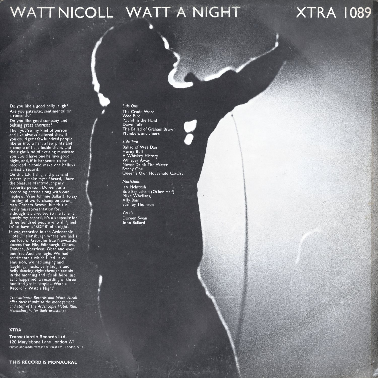 It was recorded in the Ardencaple Hotel, Helensburgh where we had a bus load of Geordies frae Newcastle, dozens frae Fife, Edinburgh, Glesca, Dundee, Aberdeen, Oban and even one frae Auchenshugle. We had sentimentals which filled us wi emulsion, we had singing and laughing, music, belly laughs and belly dancing right through tae six in the morning and it's all here just as it happened, a recording of three hundred great people — 'Watt a Record' — 'Watt a Night'