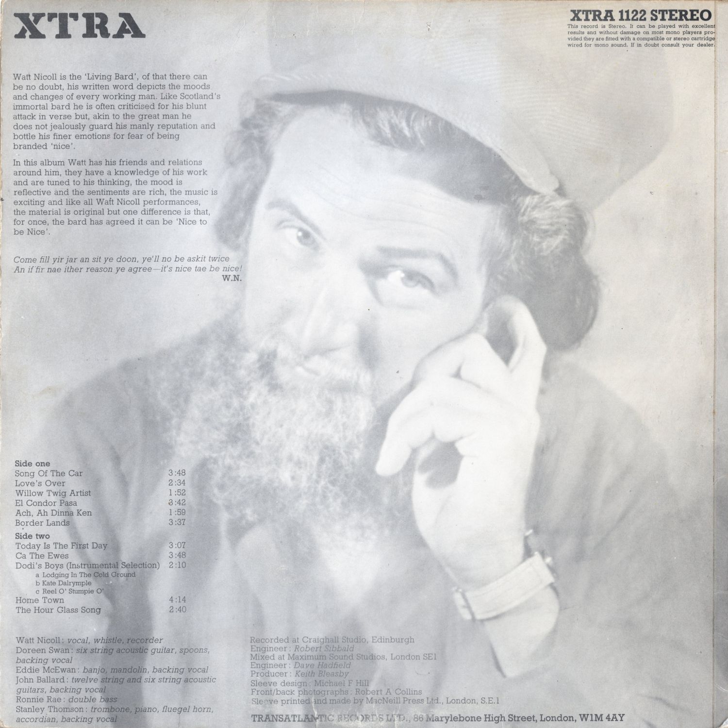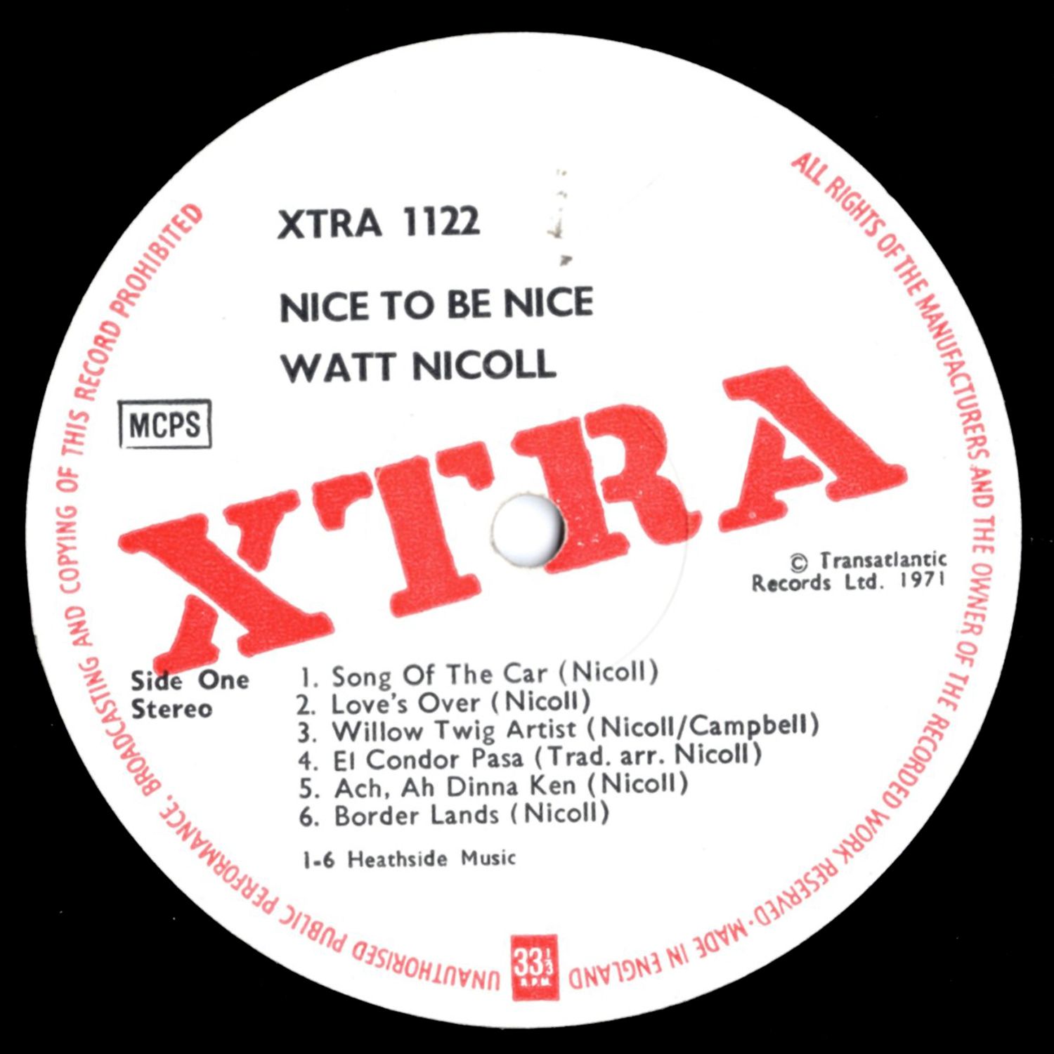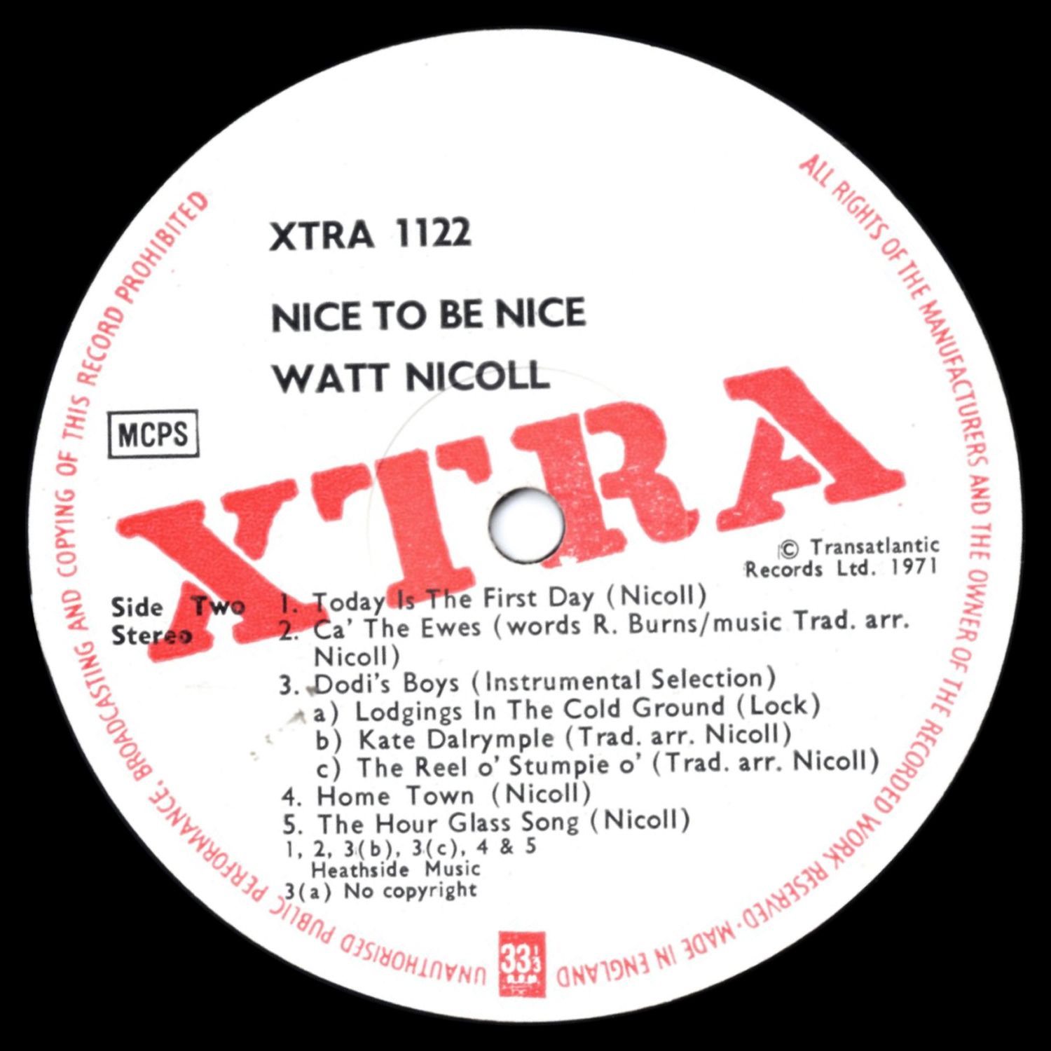 In this album Watt has his friends and relations around him, they have a knowledge of his work and are tuned to his thinking, the mood is reflective and the sentiments are rich, the music is exciting and like all Watt Nicoll performances, the material is original but one difference is that, for once, the bard has agreed it can be 'Nice to be Nice'.