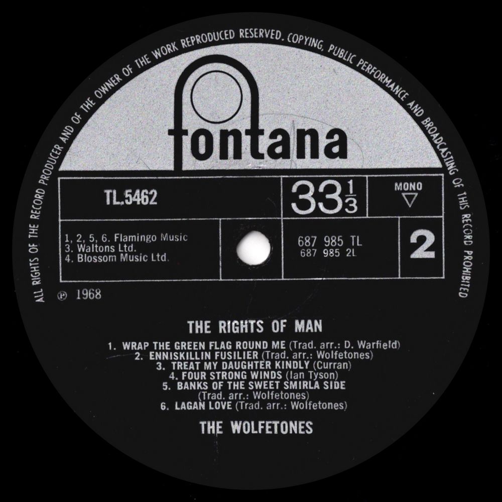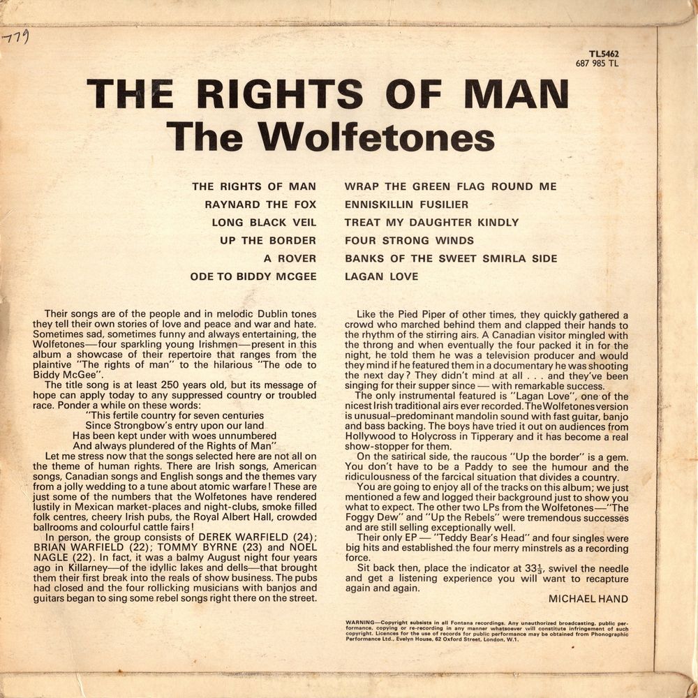 Let me stress now that the songs selected here are not all on the theme of human rights. There are Irish songs, American songs, Canadian songs and English songs and the themes vary from a jolly wedding to a tune about atomic warfare! These are just some of the numbers that the Wolfetones have rendered lustily in Mexican market-places and night-clubs, smoke filled folk centres, cheery Irish pubs, the Royal Albert Hall, crowded ballrooms and colourful cattle fairs!