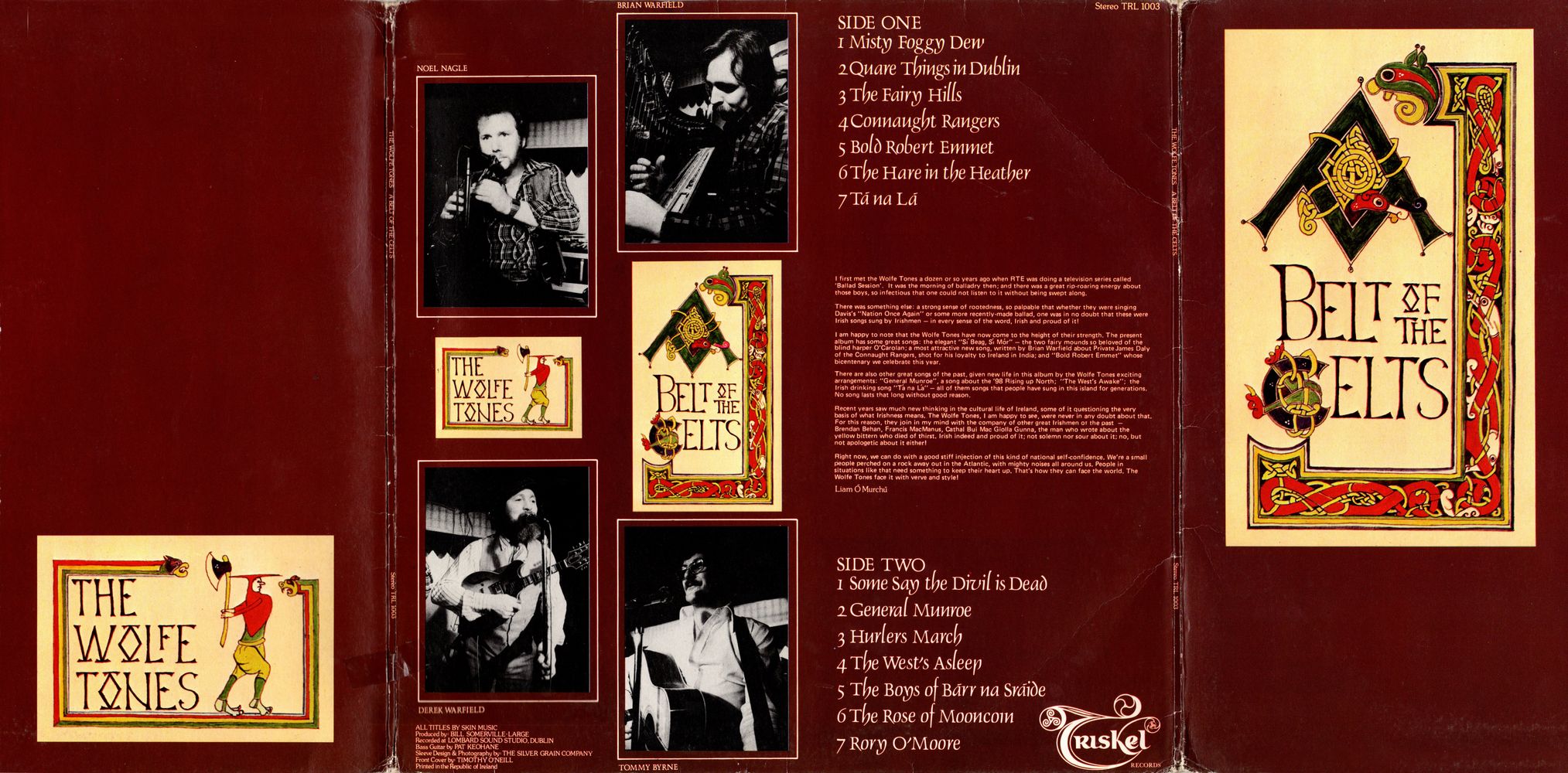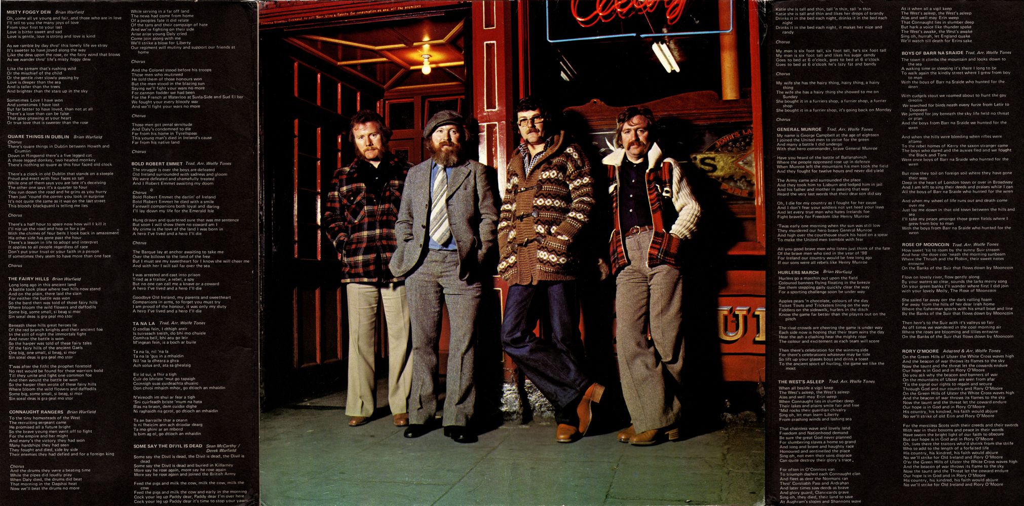 I am happy to note that the Wolfe Tones have now come to the height of their strength. The present album has some great songs: the elegant "Sí Beag, Sí Mór" — the two fairy mounds so beloved of the blind harper O'Carolan; a most attractive new song, written by Brian Warfield about Private James Daly of the Connaught Rangers, shot for his loyalty to Ireland in India; and "Bold Robert Emmet" whose bicentenary we celebrate this year.