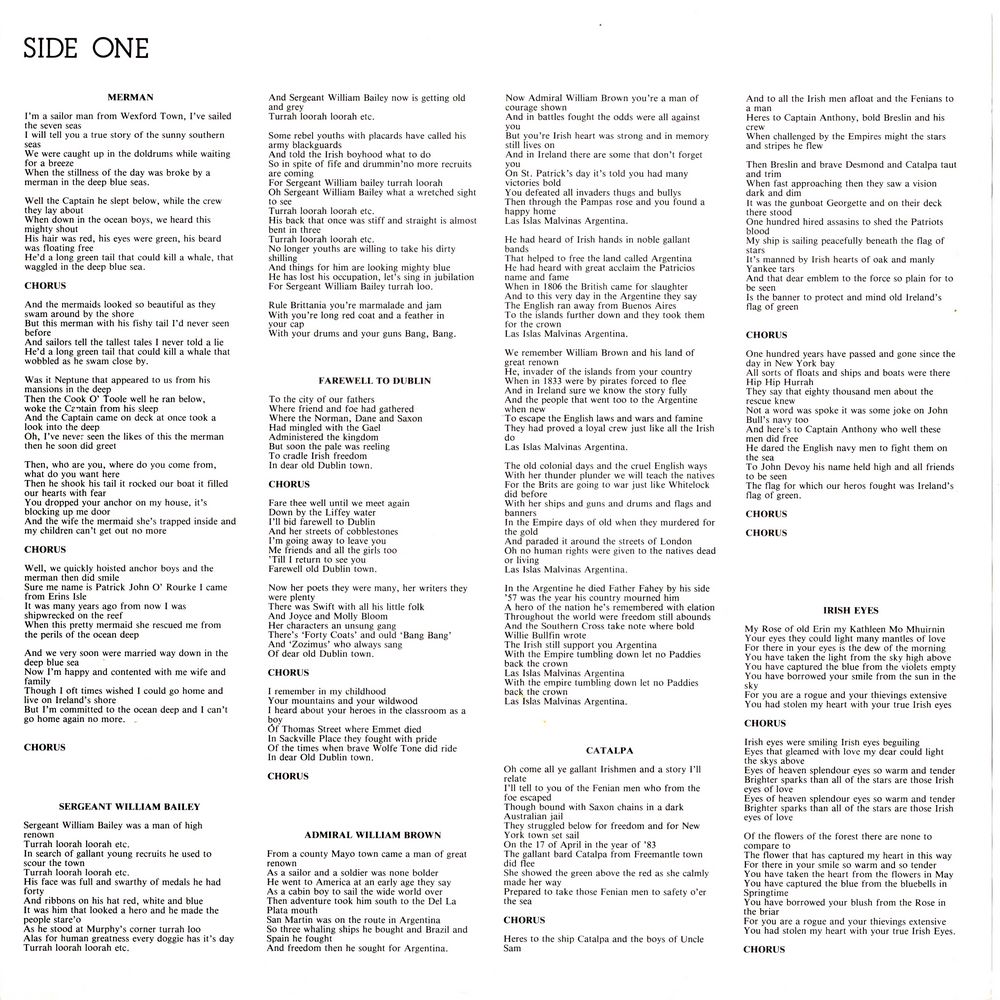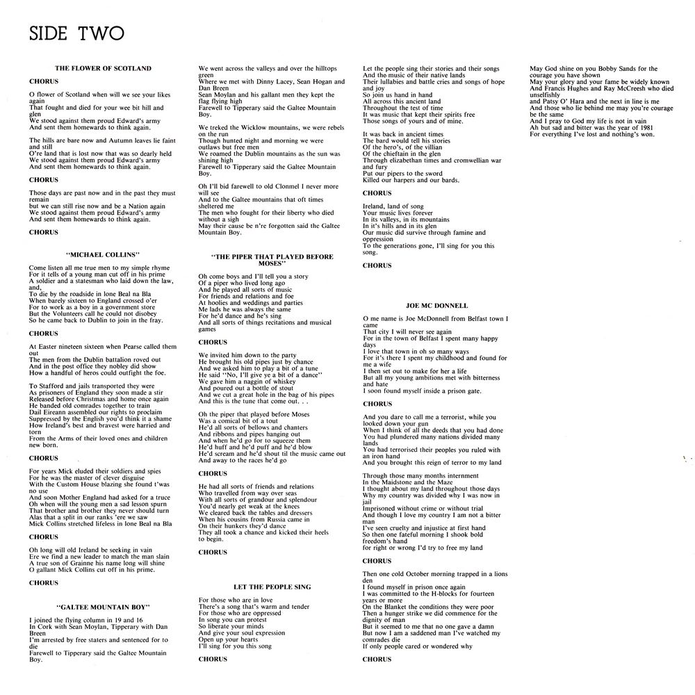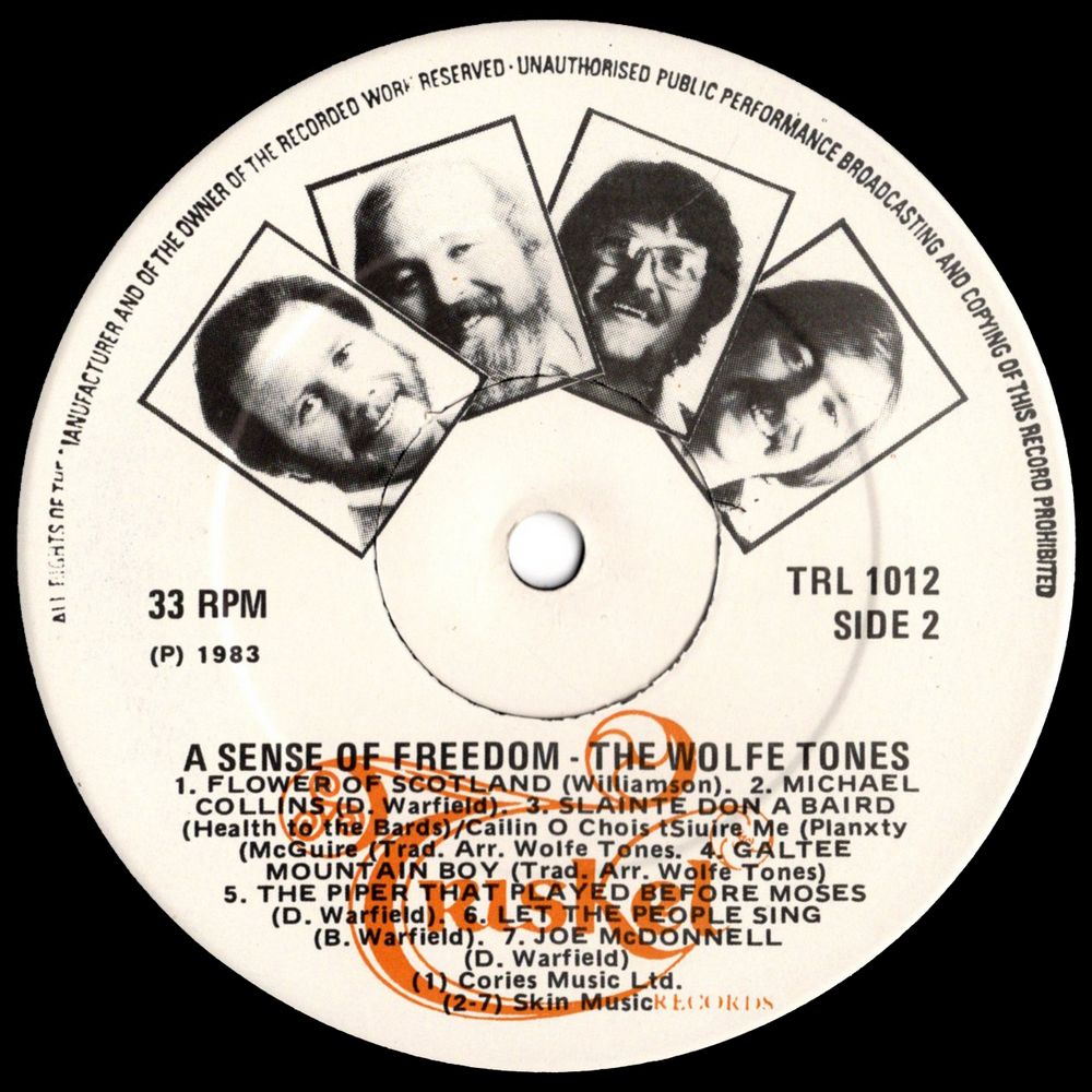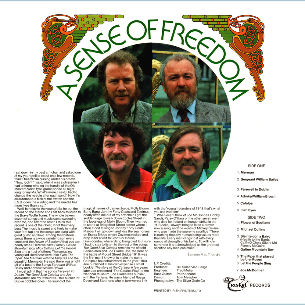 Well, fair play to the youngfella, he put the record on the stereo and I sat back to listen to the Brave Wolfe Tones The whole bakers dozen of songs and music came sweeping over me, one after the other. I think this record is one of their best, if not their very best The music is sweet and lively to make your feet tap and the songs are sung with great gusto and love. Among the thirteen songs there is a wide variety to suit every taste and the Flower of Scotland that you can nearly smell. Here we have Planxty, Galtee Mountain Boy, Mick Collins, Let the People Sing and a host of others The songs my young lad liked best were Irish Eyes, The Piper, The Merman with the fishy tail and the beautiful Mermaids. He said there was a right bit of a beat to the Songs Sergeant William Bailey and Admiral William Brown.