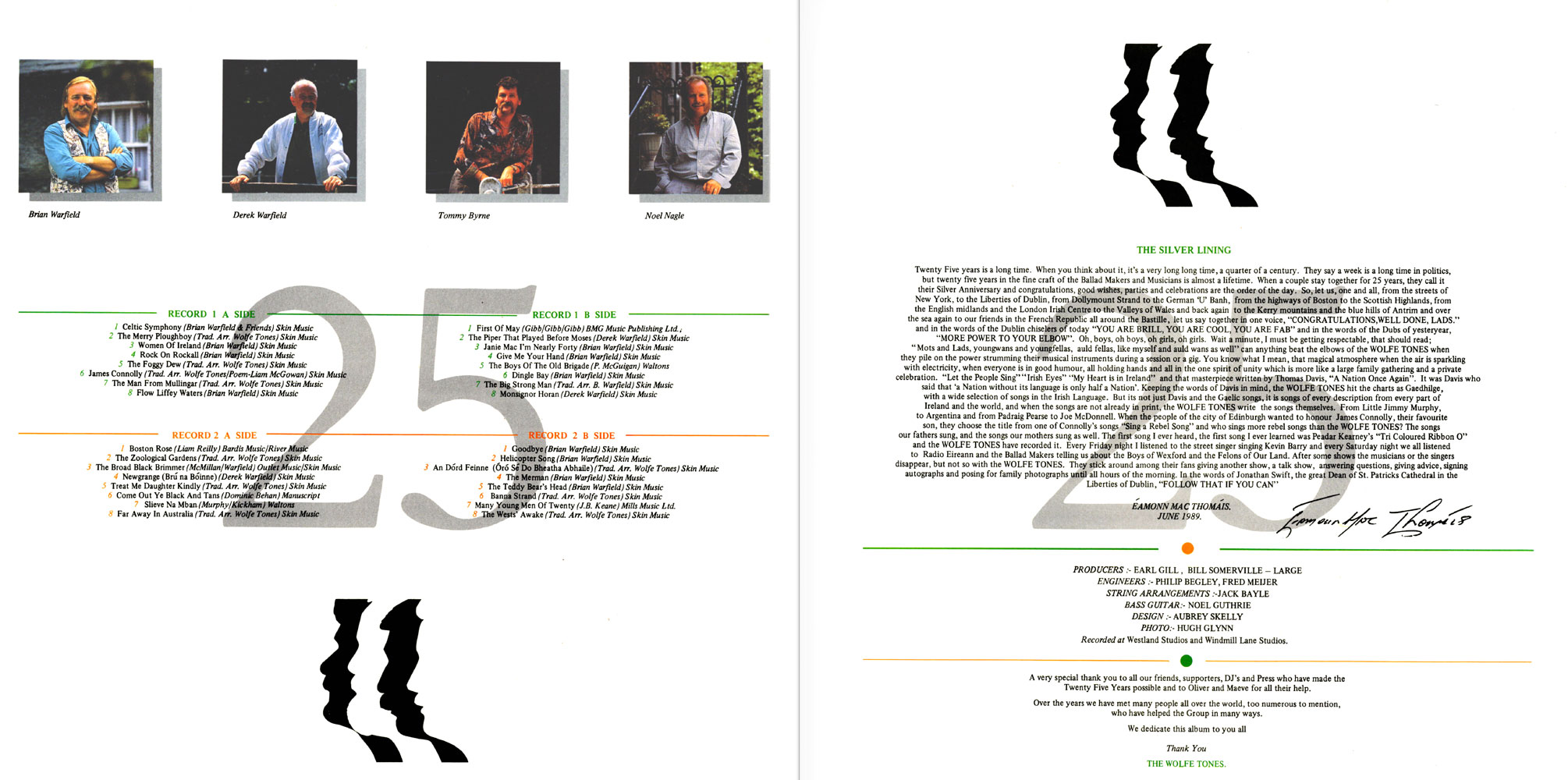 Twenty Five years is a long time. When you think about it, it's a very long long time, a quarter of a century. They say a week is a long time in politics, but twenty five years in the fine craft of the Ballad Makers and Musicians is almost a lifetime. When a couple stay together for 25 years, they call it their Silver Anniversary and congratulations, good wishes, parties and celebrations are the order of the day. So, let us, one and all, from the streets of New York, to the Liberties of Dublin, from Dollymount Strand to the German "U" Banh, from the highways of Boston to the Scottish Highlands, from the English midlands and the London Irish Centre to the Valleys of Wales and back again to the Kerry mountains and the blue hills of Antrim and over the sea again to our friends in the French Republic all around the Bastille, let us say together in one voice, "CONGRATULATIONS, WELL DONE, LADS." and in the words of the Dublin chiselers of today "YOU ARE BRILL, YOU ARE COOL, YOU ARE FAB" and in the words of the Dubs of yesteryear, "MORE POWER TO YOUR ELBOW". Oh, boys, oh boys, oh girls, oh girls. Wait a minute, I must be getting respectable, that should read;