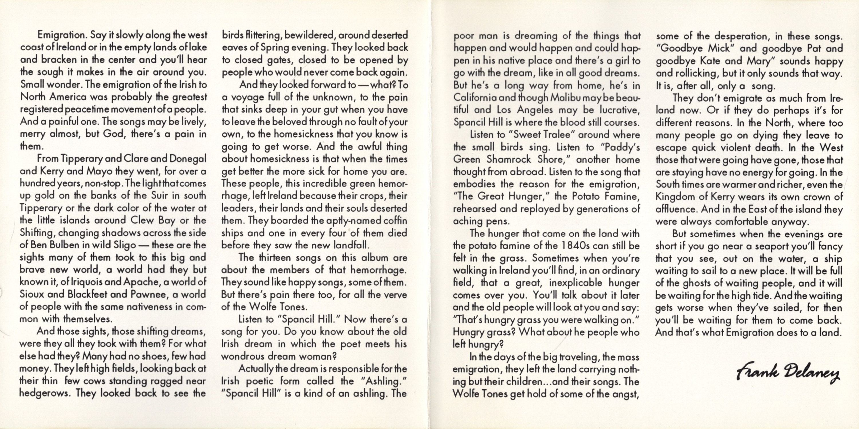In the days of the big travelling, the mass emigration, they left the land carrying nothing but their children . . . and their songs. The Wolfe Tones get hold of some of the angst, some of the desperation, in these songs. "Good-bye Mick and good-bye Pat and good-bye Kate and Mary" sounds happy and rollicking, but it only sounds that way. It is, after all, only a song.