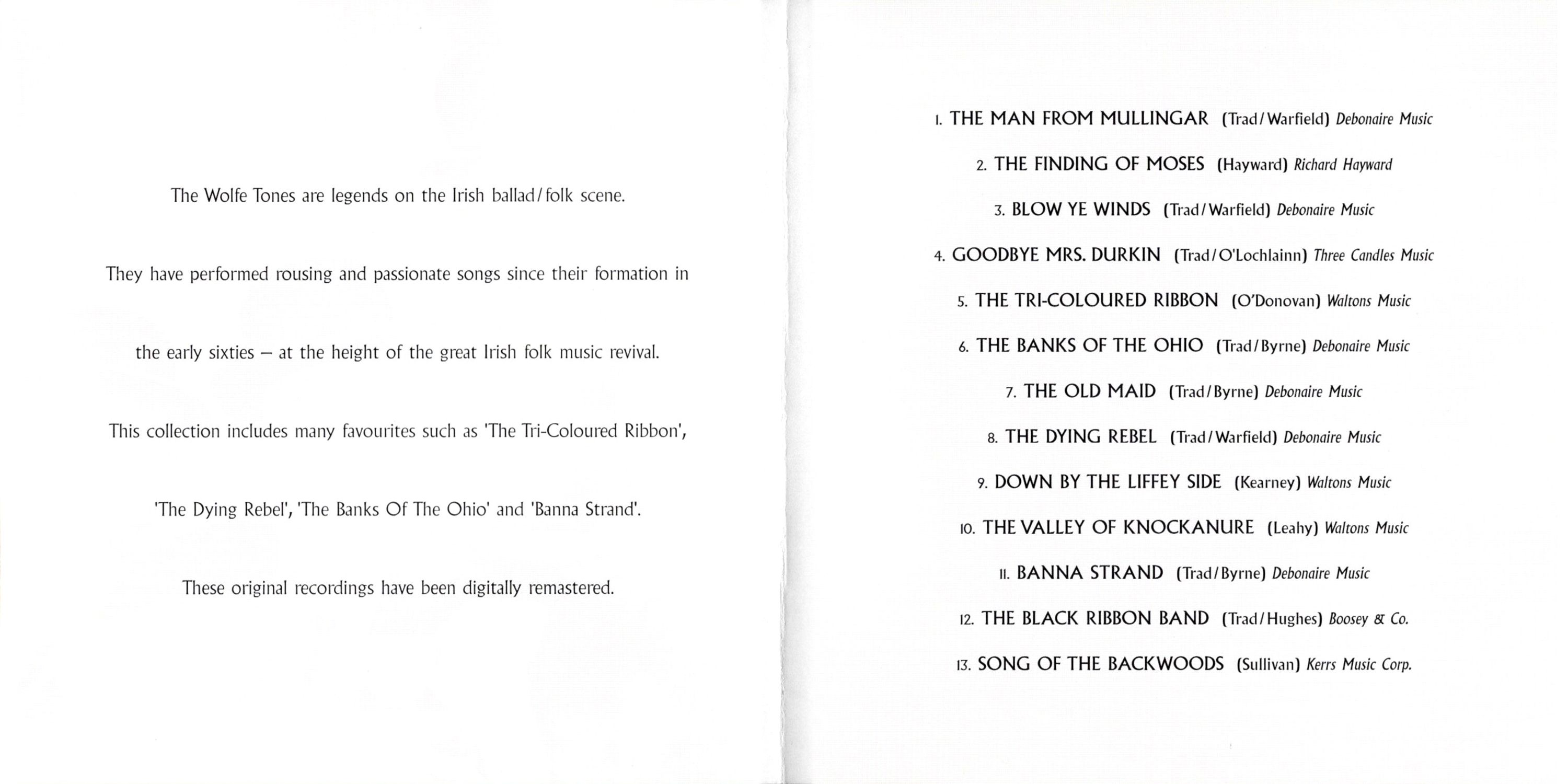 The Wolfe Tones are legends on the Irish ballad-folk scene. They have performed rousing and passionate songs since their formation in the early sixties — at the height of the great Irish folk music revival. This collection includes many favourites such as 'The Tri-Coloured Ribbon', 'The Dying Rebel', 'The Banks Of The Ohio' and 'Banna Strand'. These original recordings have been digitally remastered.