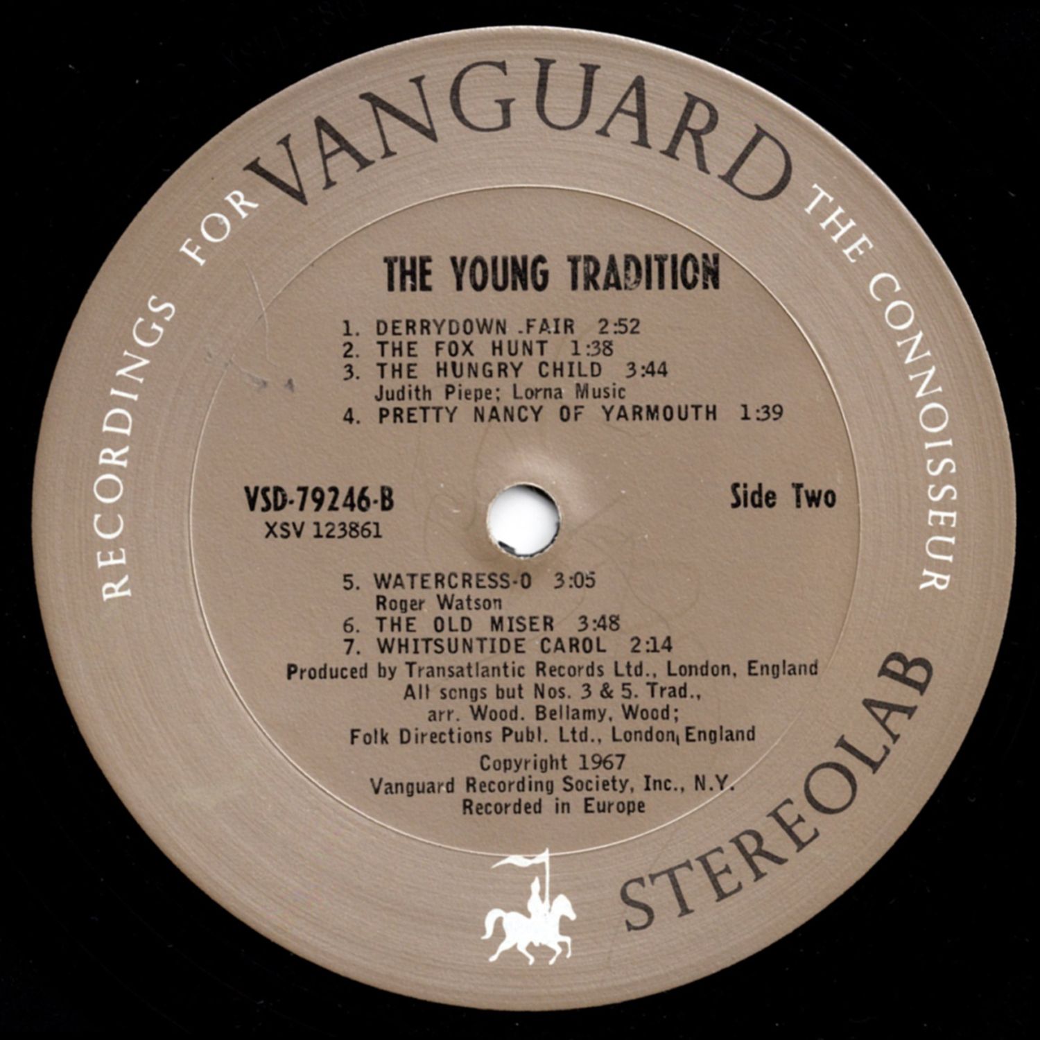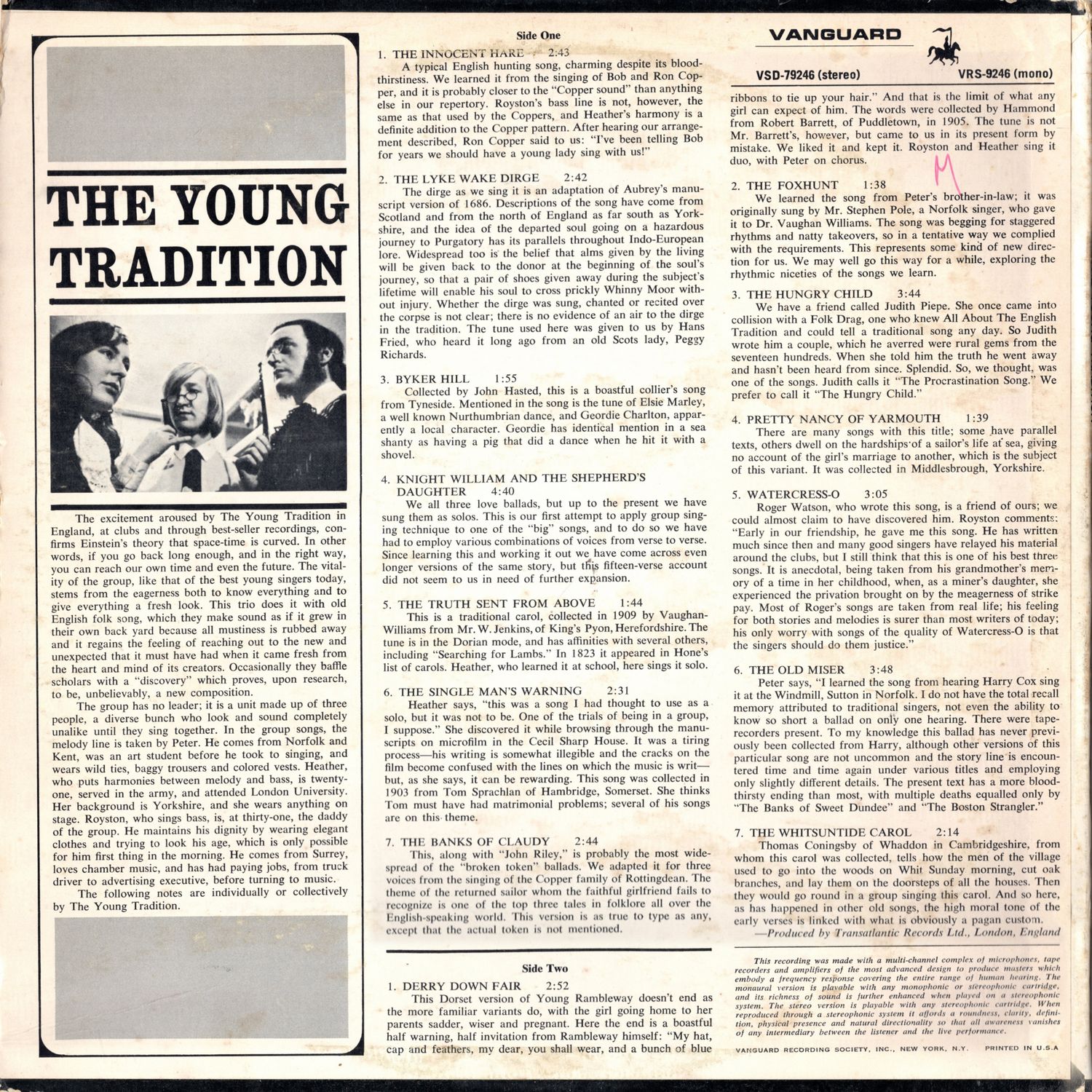 The excitement aroused by The Young Tradition in England, at clubs and through best-seller recordings, confirms Einstein's theory that space-time is curved. In other words, if you go back long enough, and in the right way, you can reach our own time and even the future. The vitality of the group, like that of the best young singers today, stems from the eagerness both to know everything and to give everything a fresh look. This trio does it with old English folk song, which they make sound as if it grew in their own back yard because all mustiness is rubbed away and it regains the feeling of reaching out to the new and unexpected that it must have had when it came fresh from the heart and mind of its creators. Occasionally they baffle scholars with a "discovery" which proves, upon research, to be, unbelievably, a new composition.