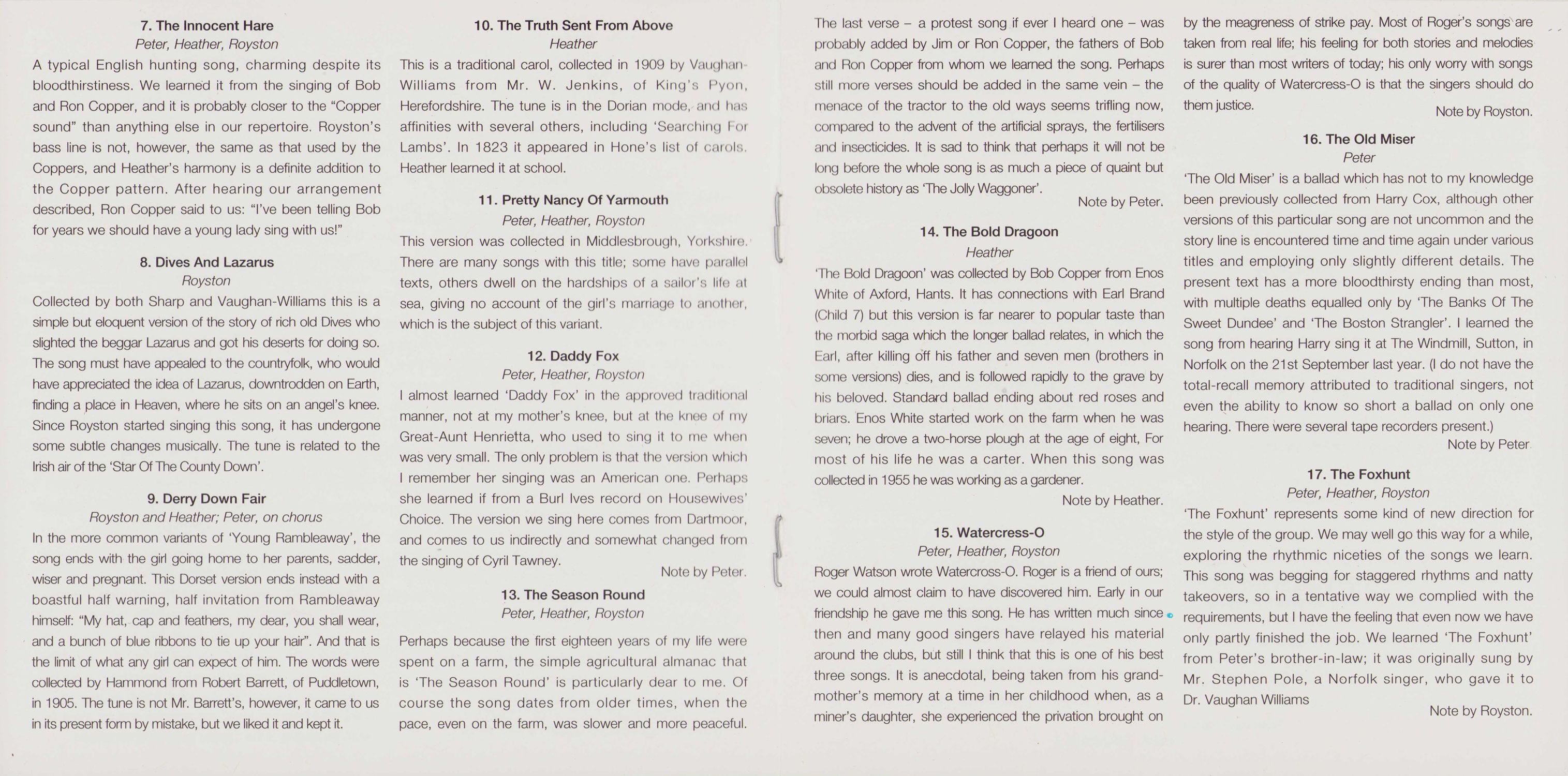 The Season Round — Peter, Heather, Royston — Perhaps because the first eighteen years of my life were spent on a farm, the simple agricultural almanac that is The Season Round' is particularly dear to me. Of course the song dates from older times, when the pace, even on the farm, was slower and more peaceful. The last verse — a protest song if ever I heard one — was probably added by Jim or Ron Copper, the fathers of Bob and Ron Copper from whom we learned the song. Perhaps still more verses should be added in the same vein — the menace of the tractor to the old ways seems trifling now, compared to the advent of the artificial sprays, the fertilisers and insecticides. It is sad to think that perhaps it will not be long before the whole song is as much a piece of quaint but obsolete history as 'The Jolly Waggoner'. — Note by Peter.