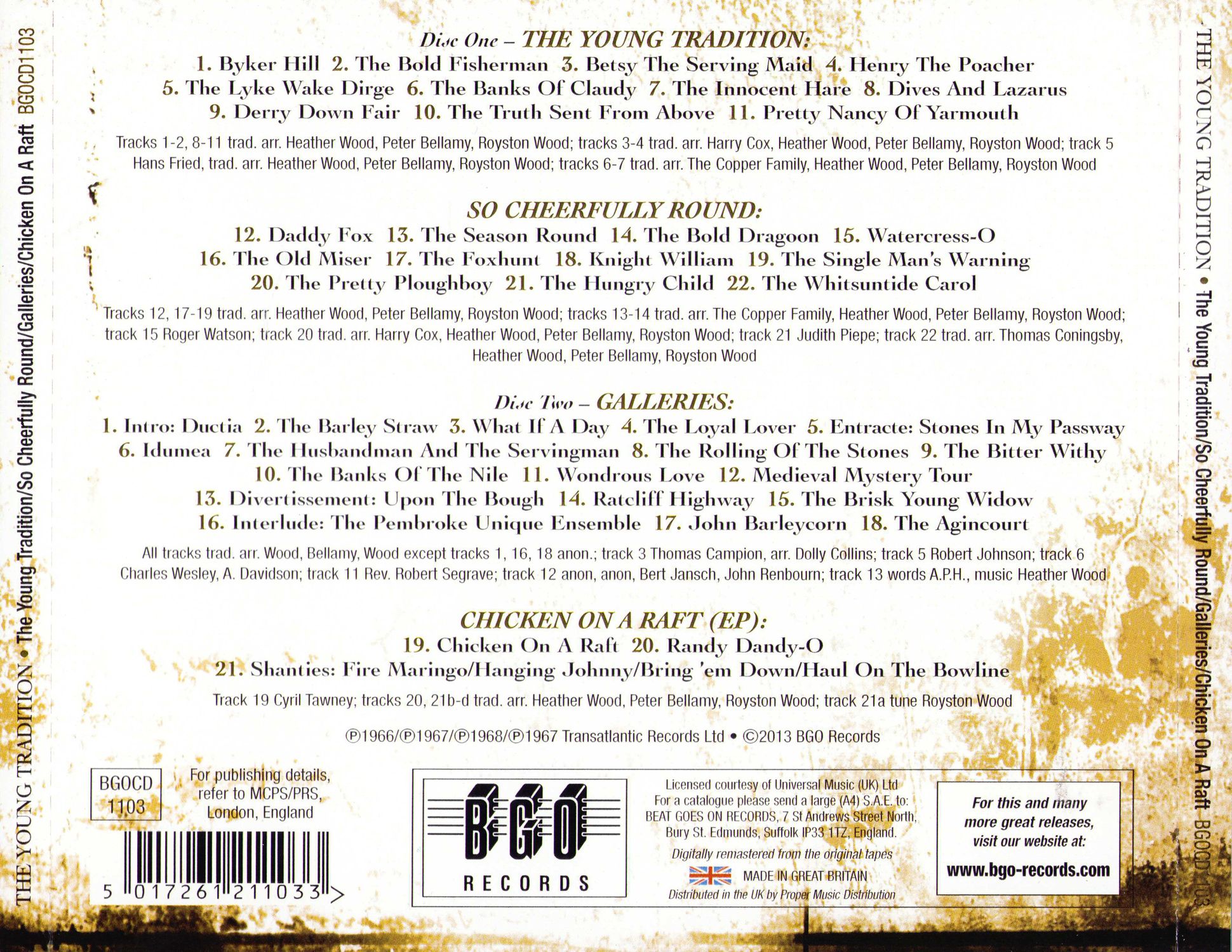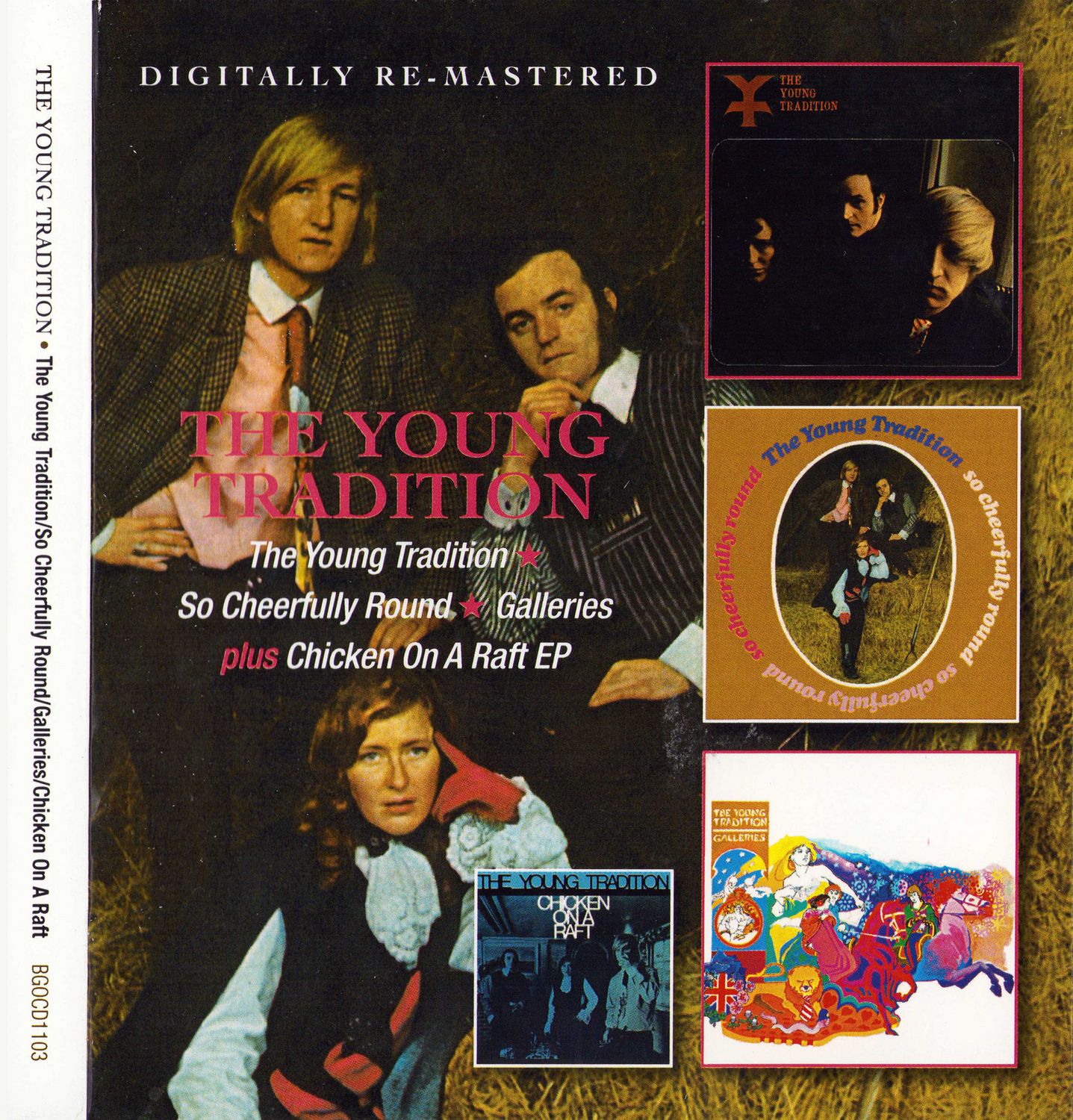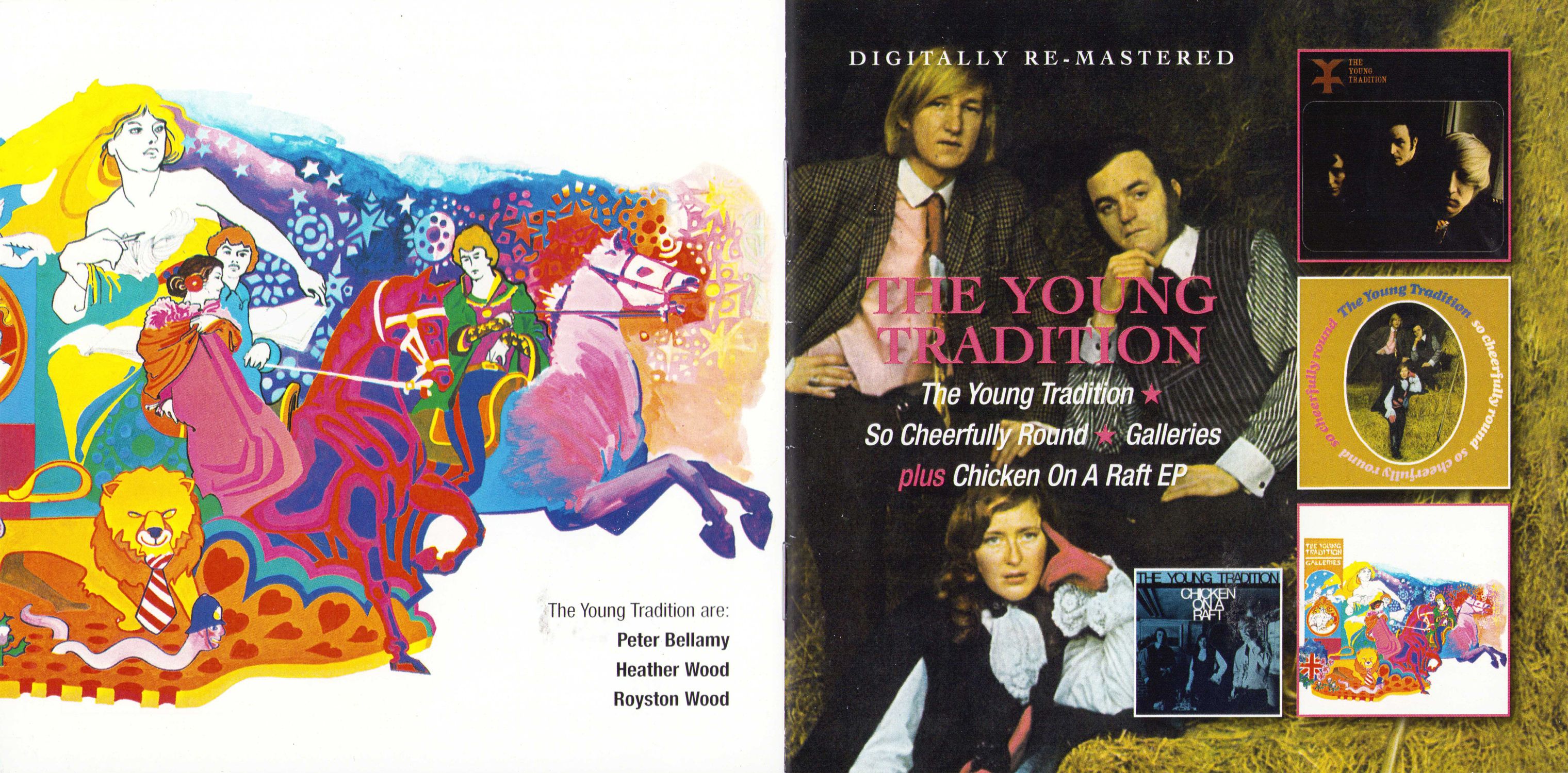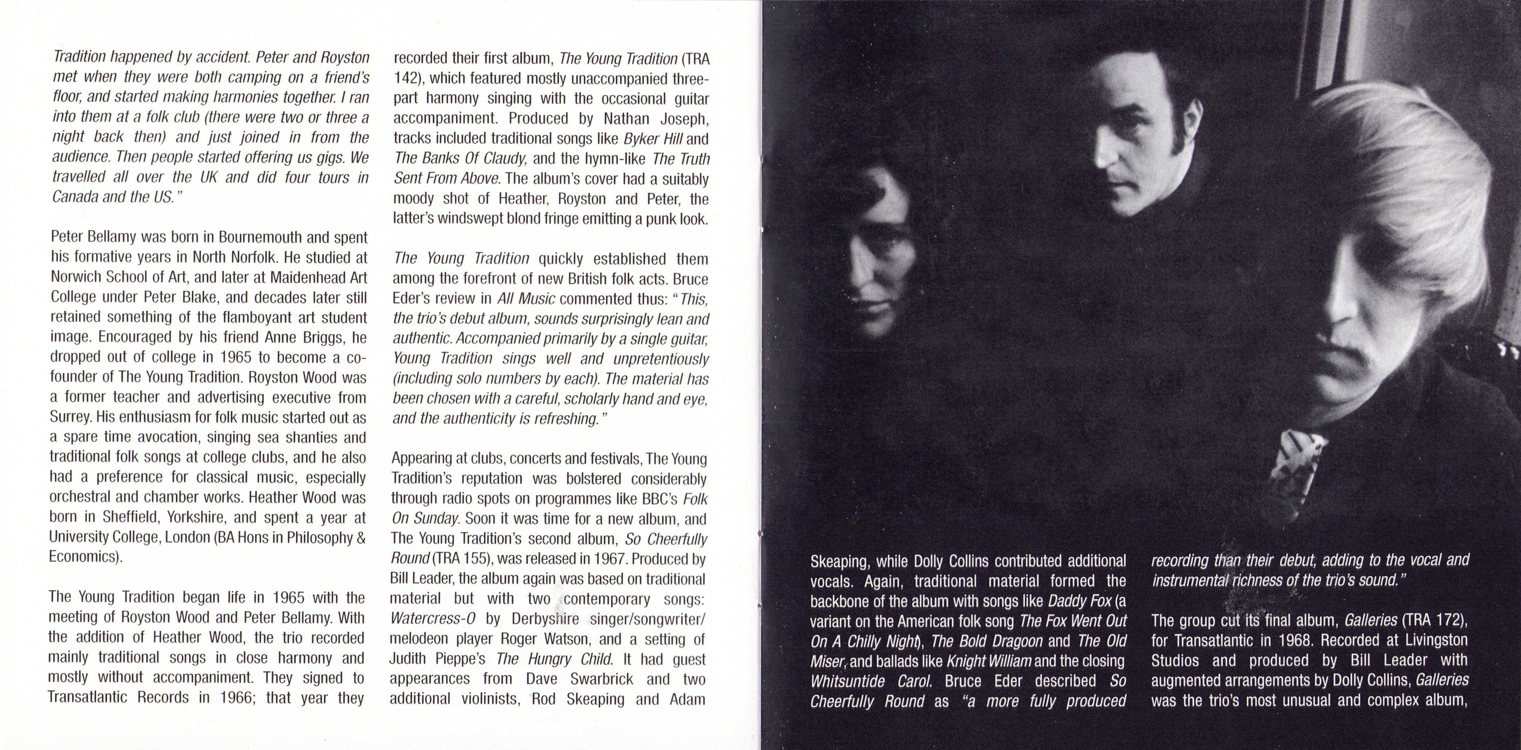 During their brief heyday between 1966 and 1969, The Young Tradition proved itself an ambitious, determined eclectic outfit, yet one rooted in traditional mores and idioms. Individually they were Peter Bellamy, Royston Wood and Heather Wood — the latter two unrelated, a point which they were adamant to emphasise, even calling their 1977 duet album No Relation. All three were accomplished individual vocal stylists with diverse musical roots. Peter was into rock'n'roll and blues, while Royston and Heather's musical likes included classical, jazz and early chamber music. Together they brought a sense of excitement, danger and diversity to an English folk scene that needed a shot in the arm, turning younger audiences on to traditional song and promoting an academic approach to their material. The group's electrifying (but not electrified) live performance of a huge repertoire of traditional songs was successfully translated onto their three Transatlantic albums (The Young Tradition, So Cheerfully Round and Galleries, plus an EP, Chicken On A Raft), which were released between 1966 and 1968. They also later imbued their treatments of traditional songs with forays into medieval music and created something timelessly unique and individual, rooted in the past but also shamelessly contemporary. To say that they were revolutionary is not an understatement. They were as radical in their time as Ewan McColl and A.L. Lloyd were in theirs, and their influence continues today to artists like Bellowhead, Jackie Oates, Bella Hardy and Eliza Carthy. In 1996, assessing the impact that The Young Tradition had on their emergence, Heather Wood wrote: "It was a case of being in the right place at the right time: London in the Swinging Sixties. But instead of being into rock'n'roll, we were into traditional English folk music. The Young Tradition happened by accident. Peter and Royston met when they were both camping on a friend's floor, and started making harmonies together. I ran into them at a folk club (there were two or three a night back then) and just joined in from the audience. Then people started offering us gigs. We travelled all over the UK and did four tours in Canada and the US."