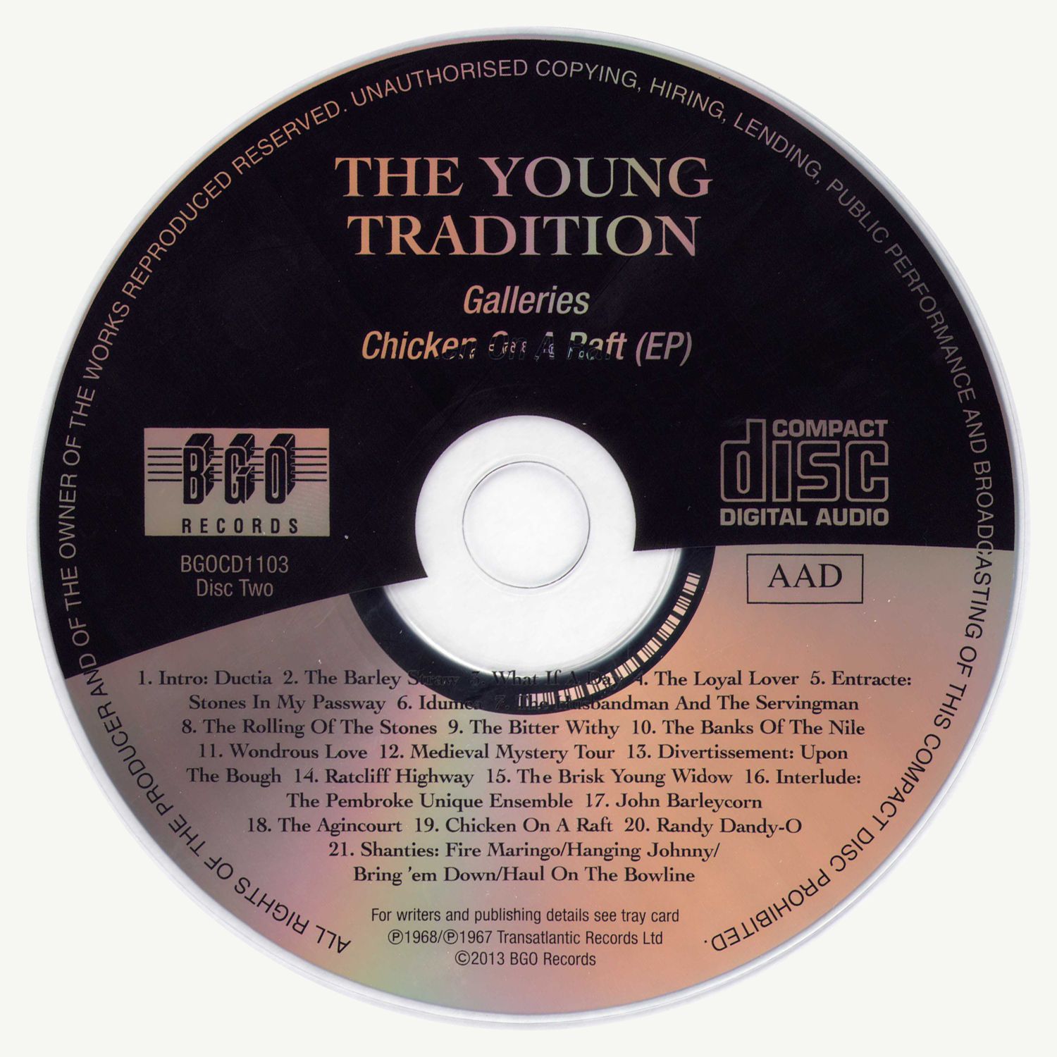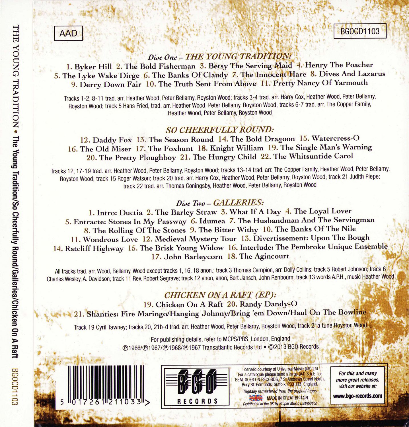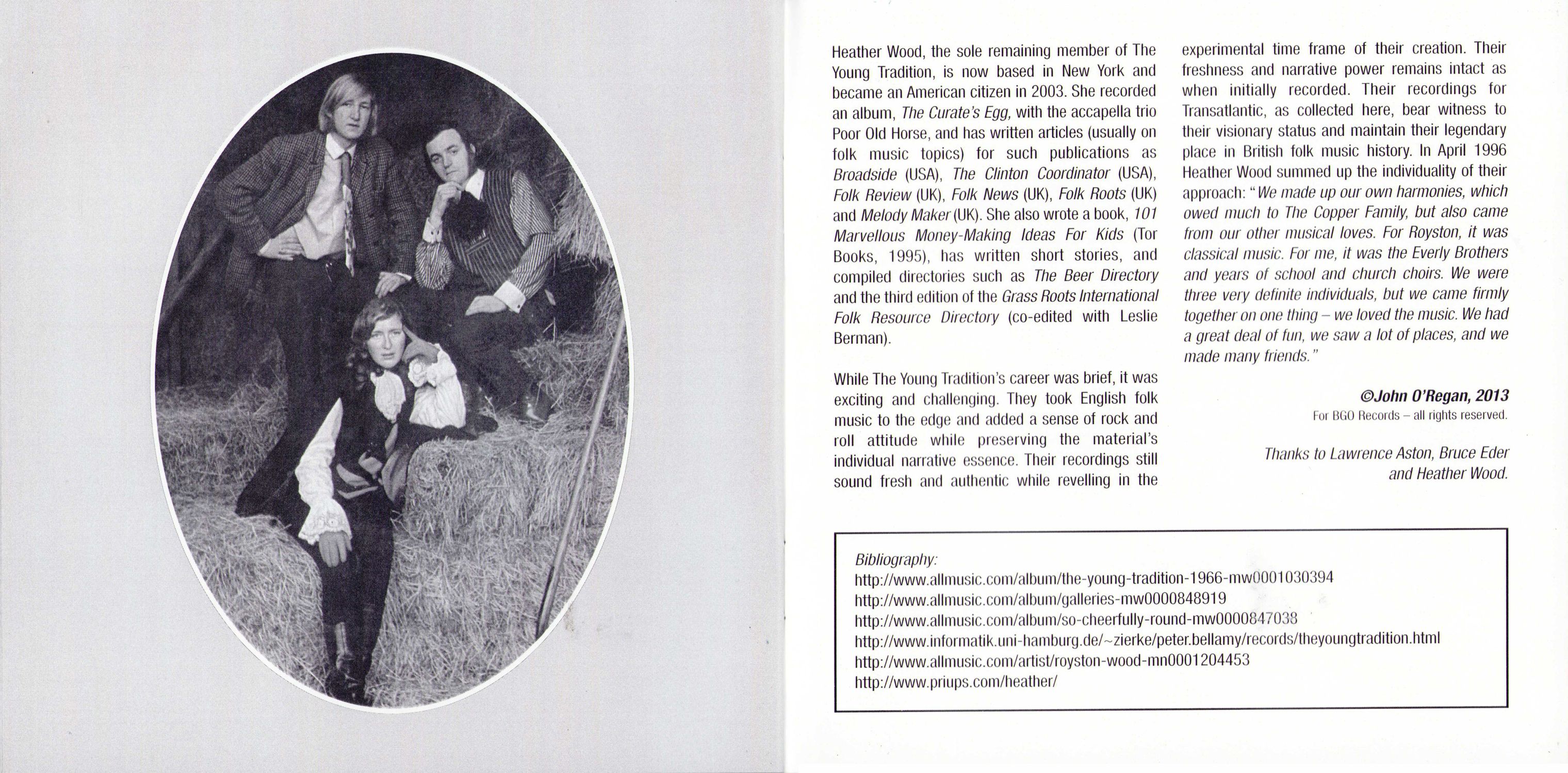 While The Young Tradition's career was brief, it was exciting and challenging. They took English folk music to the edge and added a sense of rock and roll attitude while preserving the material's individual narrative essence. Their recordings still sound fresh and authentic while revelling in the experimental time frame of their creation. Their freshness and narrative power remains intact as when initially recorded. Their recordings for Transatlantic, as collected here, bear witness to their visionary status and maintain their legendary place in British folk music history. In April 1996 Heather Wood summed up the individuality of their approach: "We made up our own harmonies, which owed much to The Copper Family, but also came from our other musical loves. For Royston, it was classical music. For me, it was the Everly Brothers and years of school and church choirs. We were three very definite individuals, but we came firmly together on one thing — we loved the music. We had a great deal of fun, we saw a lot of places, and we made many friends."
