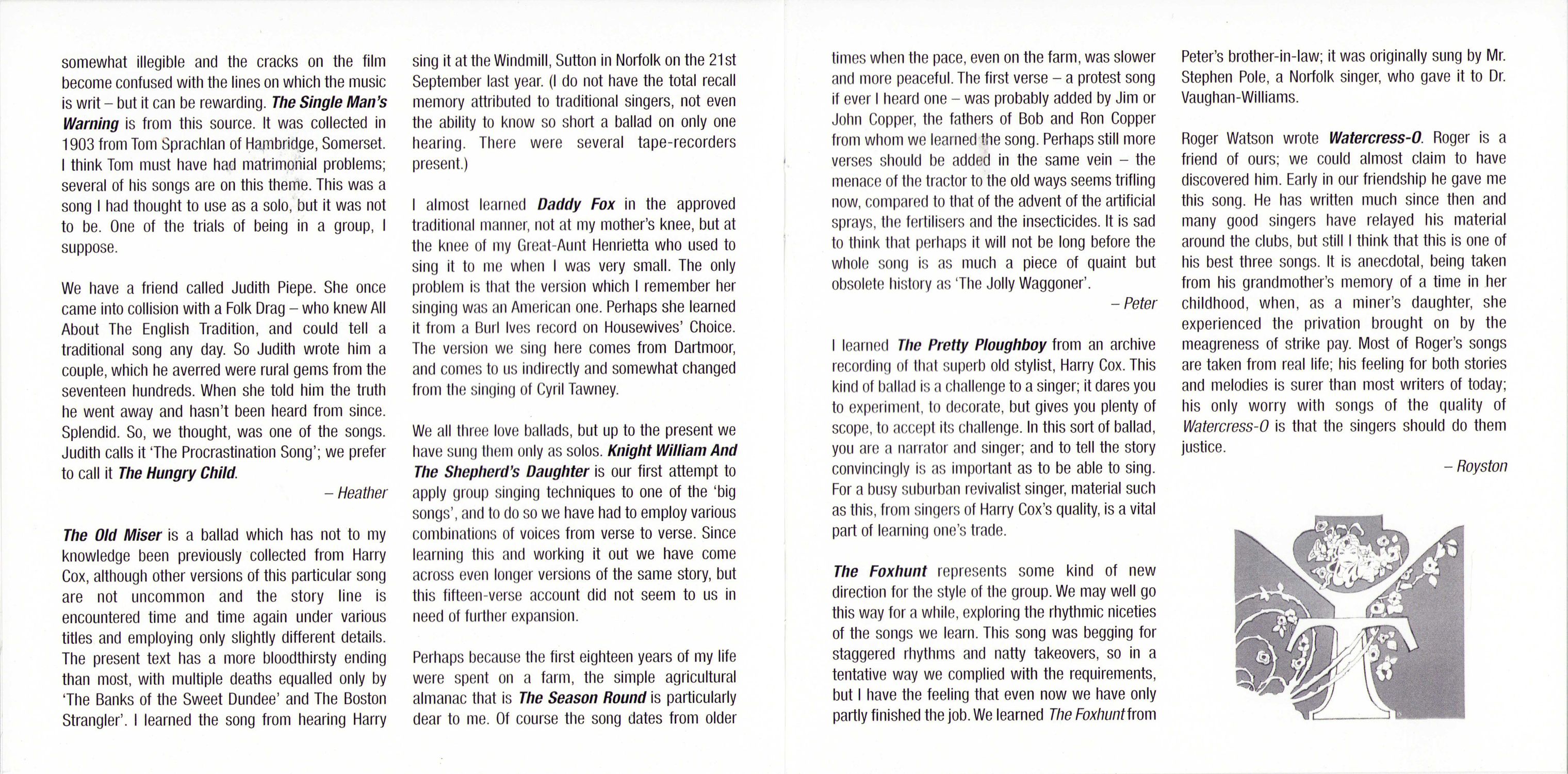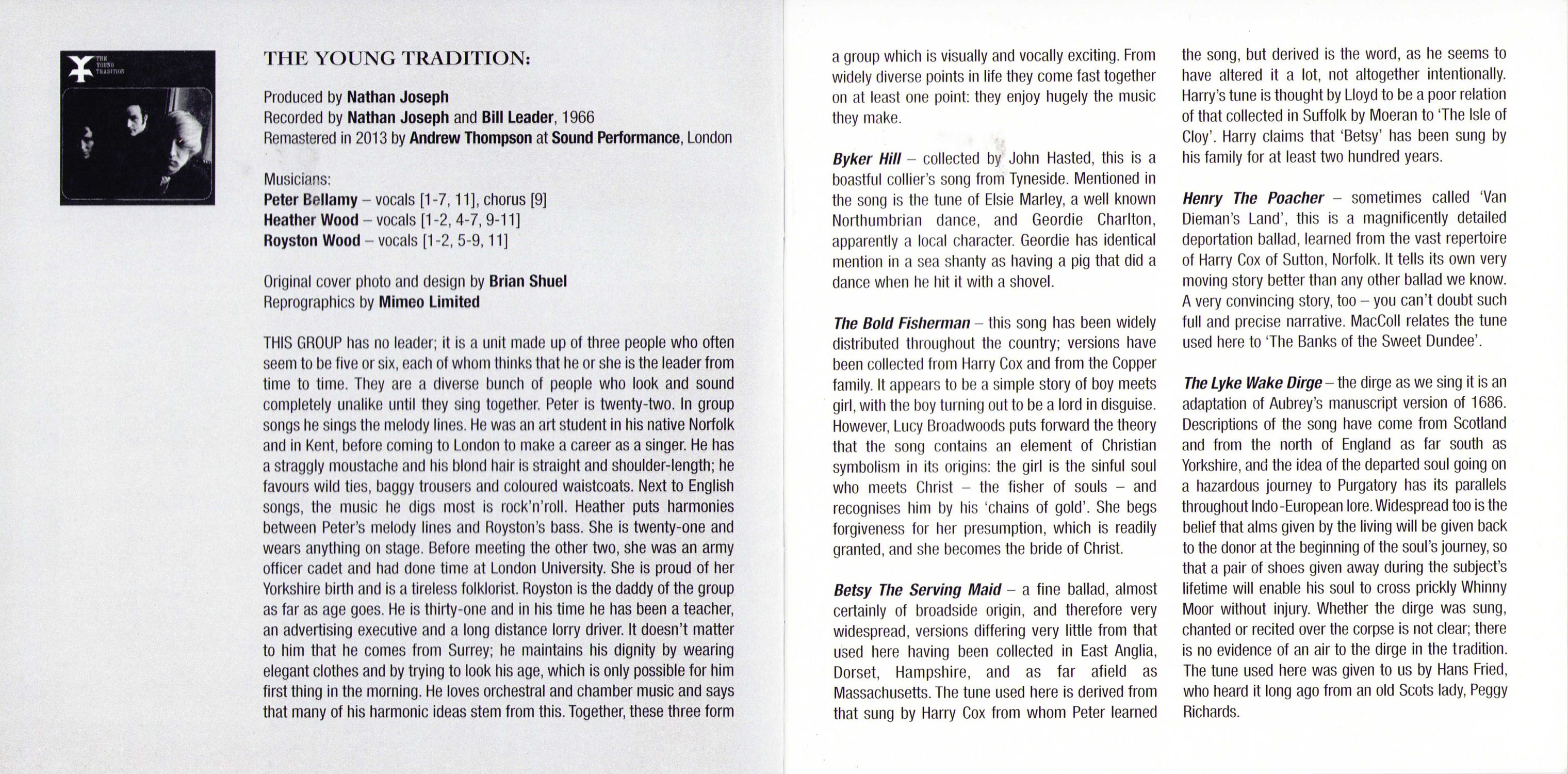 Peter Bellamy was born in Bournemouth and spent his formative years in North Norfolk. He studied at Norwich School of Art, and later at Maidenhead Art College under Peter Blake, and decades later still retained something of the flamboyant art student image. Encouraged by his friend Anne Briggs, he dropped out of college in 1965 to become a cofounder of The Young Tradition. Royston Wood was a former teacher and advertising executive from Surrey. His enthusiasm for folk music started out as a spare time avocation, singing sea shanties and traditional folk songs at college clubs, and he also had a preference for classical music, especially orchestral and chamber works. Heather Wood was born in Sheffield, Yorkshire, and spent a year at University College, London (BA Hons in Philosophy & Economics).