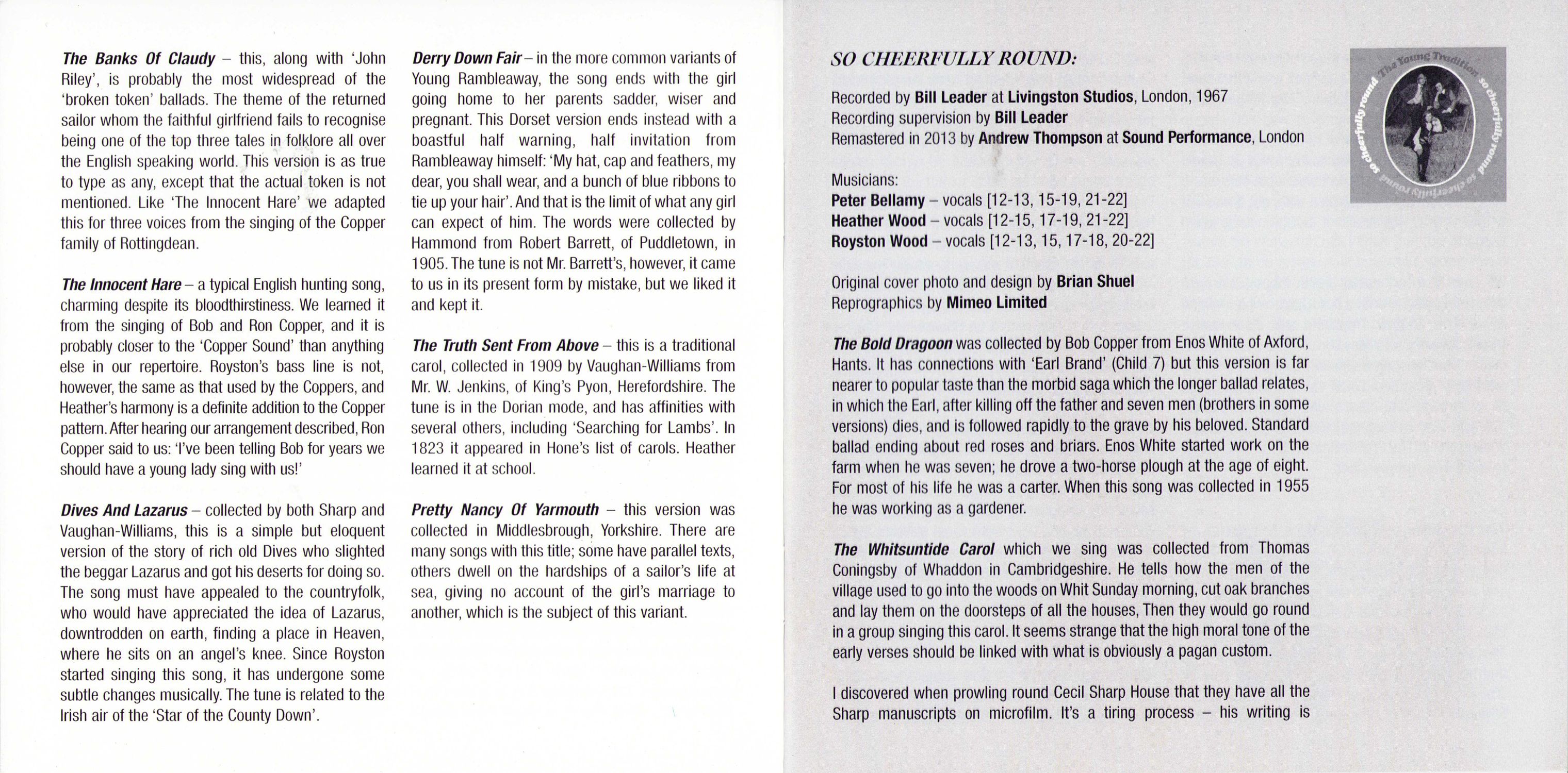 Appearing at clubs, concerts and festivals, The Young Tradition's reputation was bolstered considerably through radio spots on programmes like BBC's Folk On Sunday. Soon it was time for a new album, and The Young Tradition's second album, So Cheerfully Round {TRA 155), was released in 1967. Produced by Bill Leader, the album again was based on traditional material but with two contemporary songs: Watercress-O by Derbyshire singer/songwriter/melodeon player Roger Watson, and a setting of Judith Pieppe's The Hungry Child. It had guest appearances from Dave Swarbrick and two additional violinists, Rod Skeaping and Adam Skeaping, while Dolly Collins contributed additional vocals. Again, traditional material formed the backbone of the album with songs like Daddy Fox (a variant on the American folk song The Fox Went Out On A Chilly Night), The Bold Dragoon and The Old Miser, and ballads like Knight William and the closing Whitsuntide Carol. Bruce Eder described So Cheerfully Round as "a more fully produced recording than their debut, adding to the vocal and instrumental richness of the trio's sound."