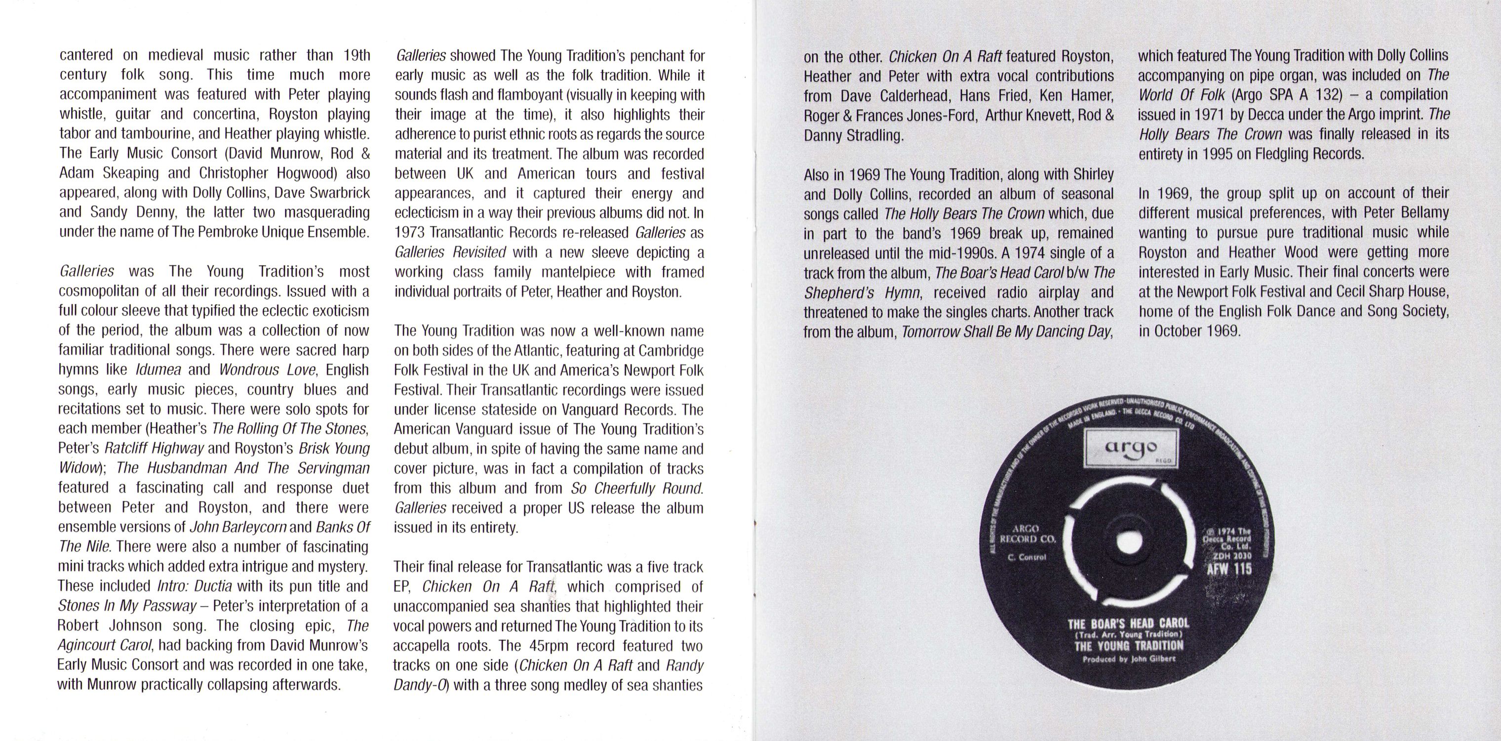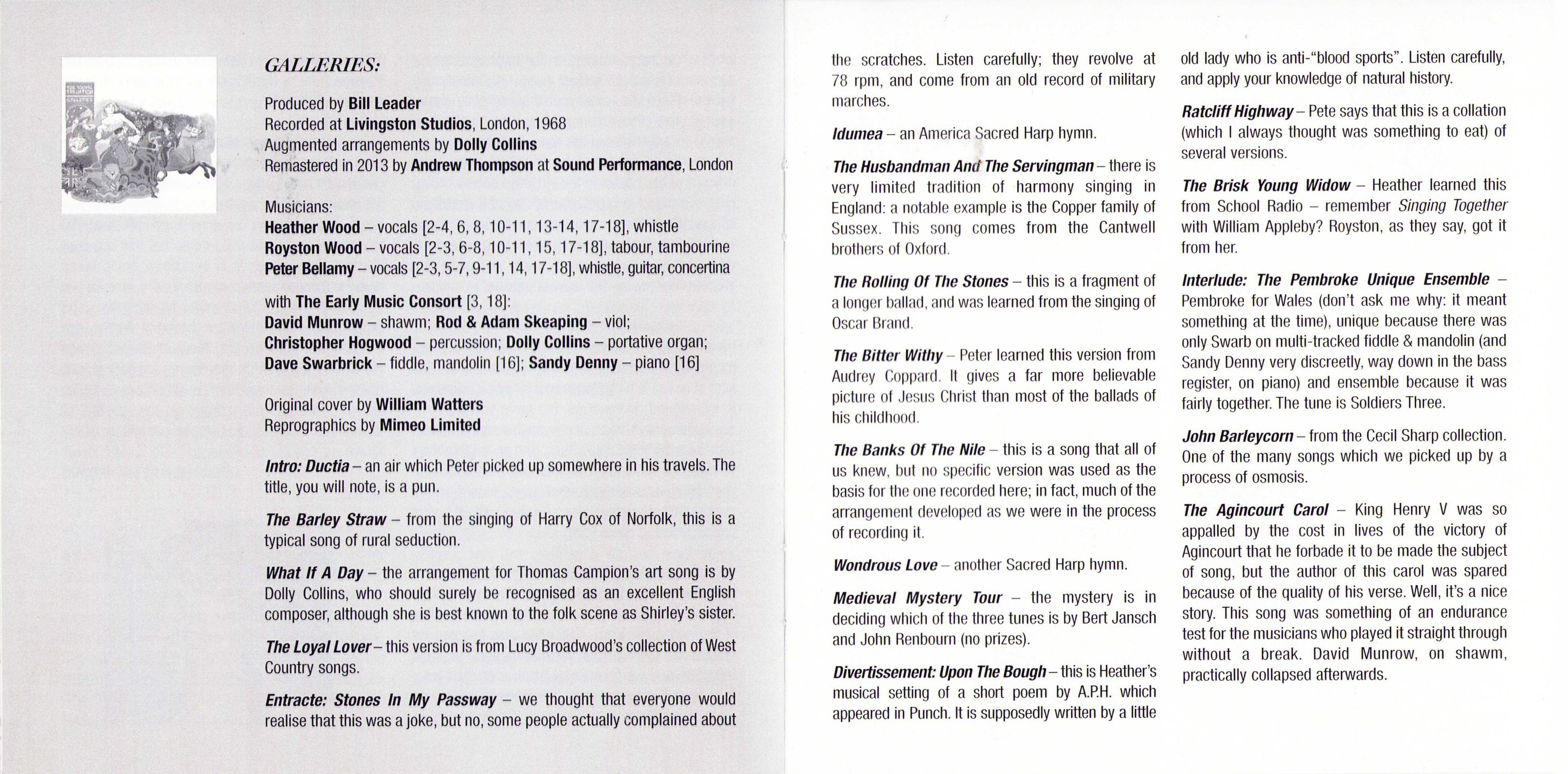 Galleries was The Young Tradition's most cosmopolitan of all their recordings. Issued with a full colour sleeve that typified the eclectic exoticism of the period, the album was a collection of now familiar traditional songs. There were sacred harp hymns like Idumea and Wondrous Love, English songs, early music pieces, country blues and recitations set to music. There were solo spots for each member (Heather's The Rolling Of The Stones, Peter's Ratcliff Highway and Royston's Brisk Young Widow); The Husbandman And The Servingman featured a fascinating call and response duet between Peter and Royston, and there were ensemble versions of John Barleycorn and Banks Of The Nile. There were also a number of fascinating mini tracks which added extra intrigue and mystery. These included Intro: Ductia with its pun title and Stones In My Passway — Peter's interpretation of a Robert Johnson song. The closing epic, The Agincourt Carol, had backing from David Munrow's Early Music Consort and was recorded in one take, with Munrow practically collapsing afterwards.