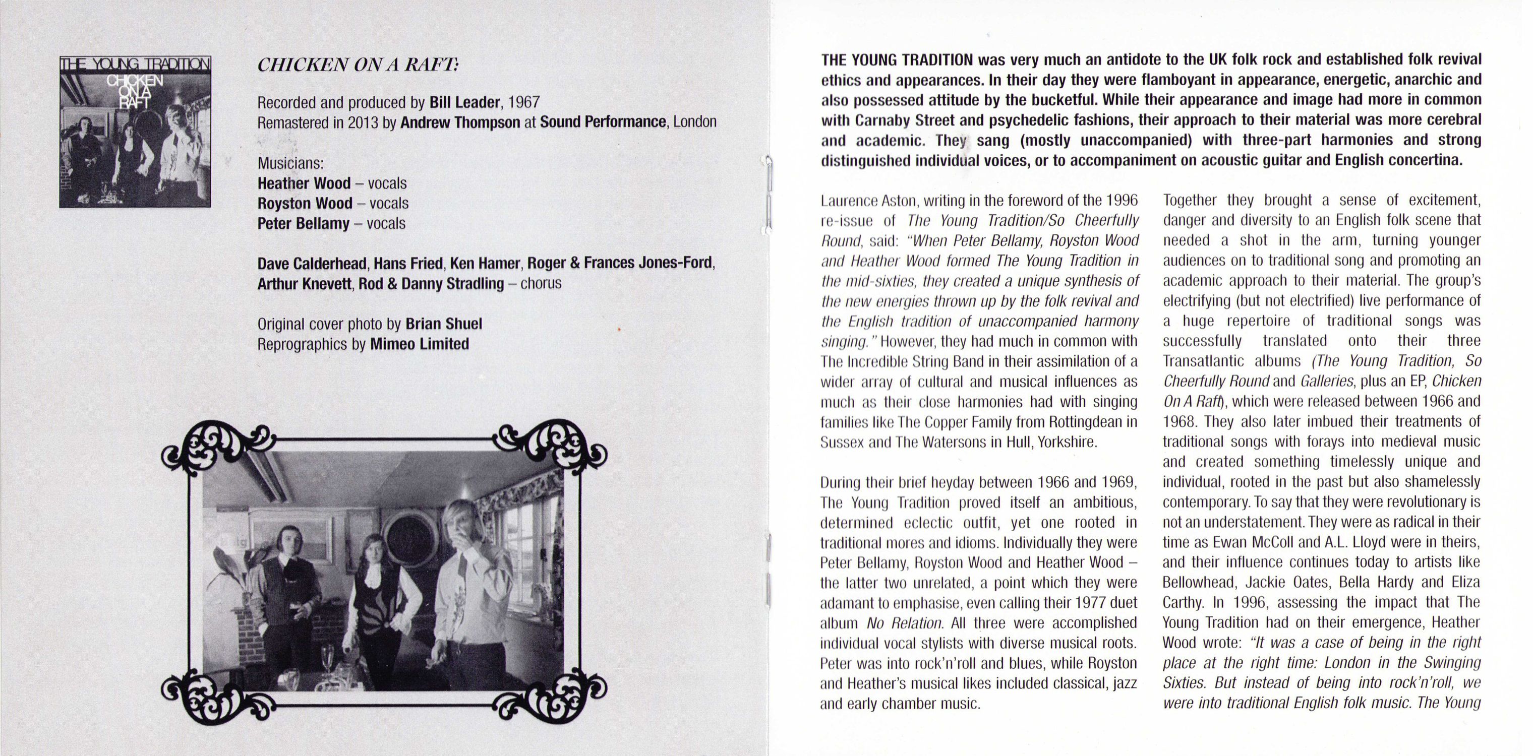 Their final release for Transatlantic was a five track EP, Chicken On A Raft, which comprised of unaccompanied sea shanties that highlighted their vocal powers and returned The Young Tradition to its accapella roots. The 45rpm record featured two tracks on one side (Chicken On A Raft and Randy Dandy-O) with a three song medley of sea shanties on the other. Chicken On A Raft featured Royston, Heather and Peter with extra vocal contributions from Dave Calderhead, Hans Fried, Ken Hamer, Roger & Frances Jones-Ford, Arthur Knevett, Rod & Danny Stradling.