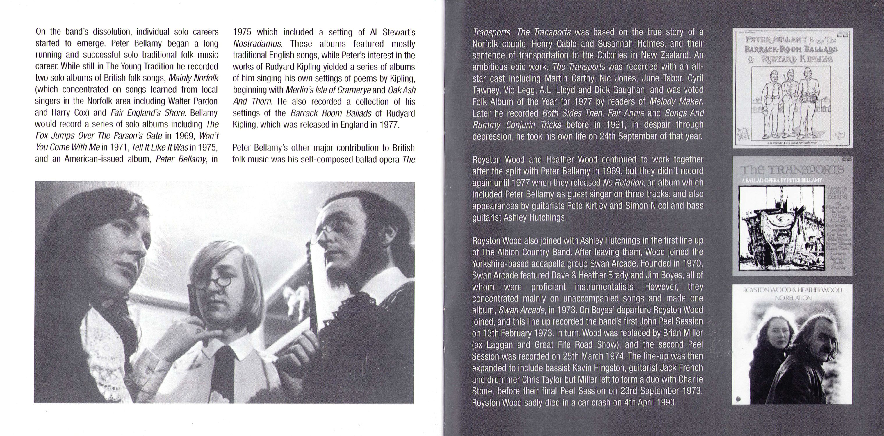Royston Wood and Heather Wood continued to work together after the split with Peter Bellamy in 1969, but they didn't record again until 1977 when they released No Relation, an album which included Peter Bellamy as guest singer on three tracks, and also appearances by guitarists Pete Kirtley and Simon Nicol and bass guitarist Ashley Hutchings.